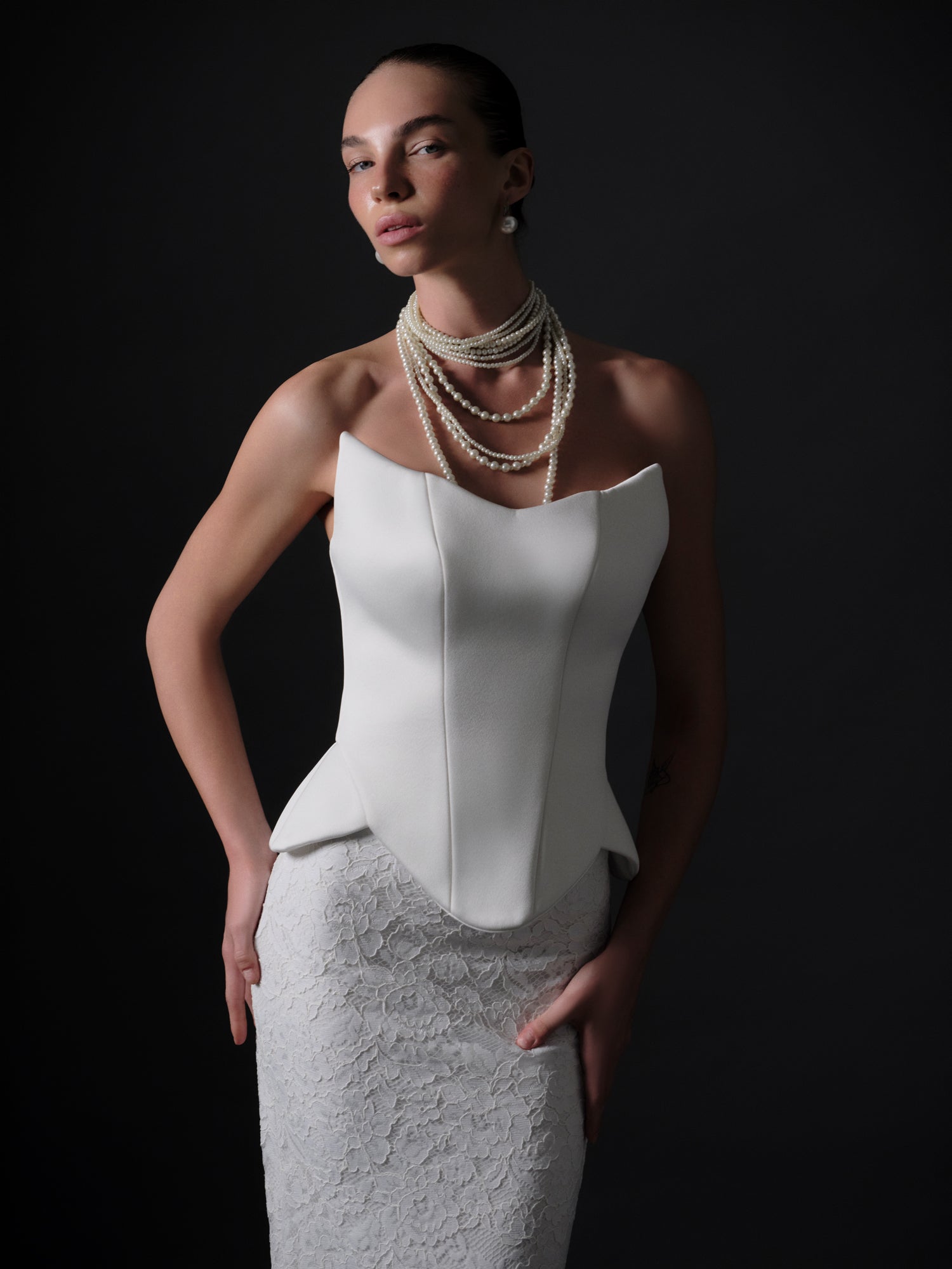 Korse formu ve dantel eteğiyle Alliance Noble Dress, bridal couture’un asaleti ve gücünü bir araya getirir.