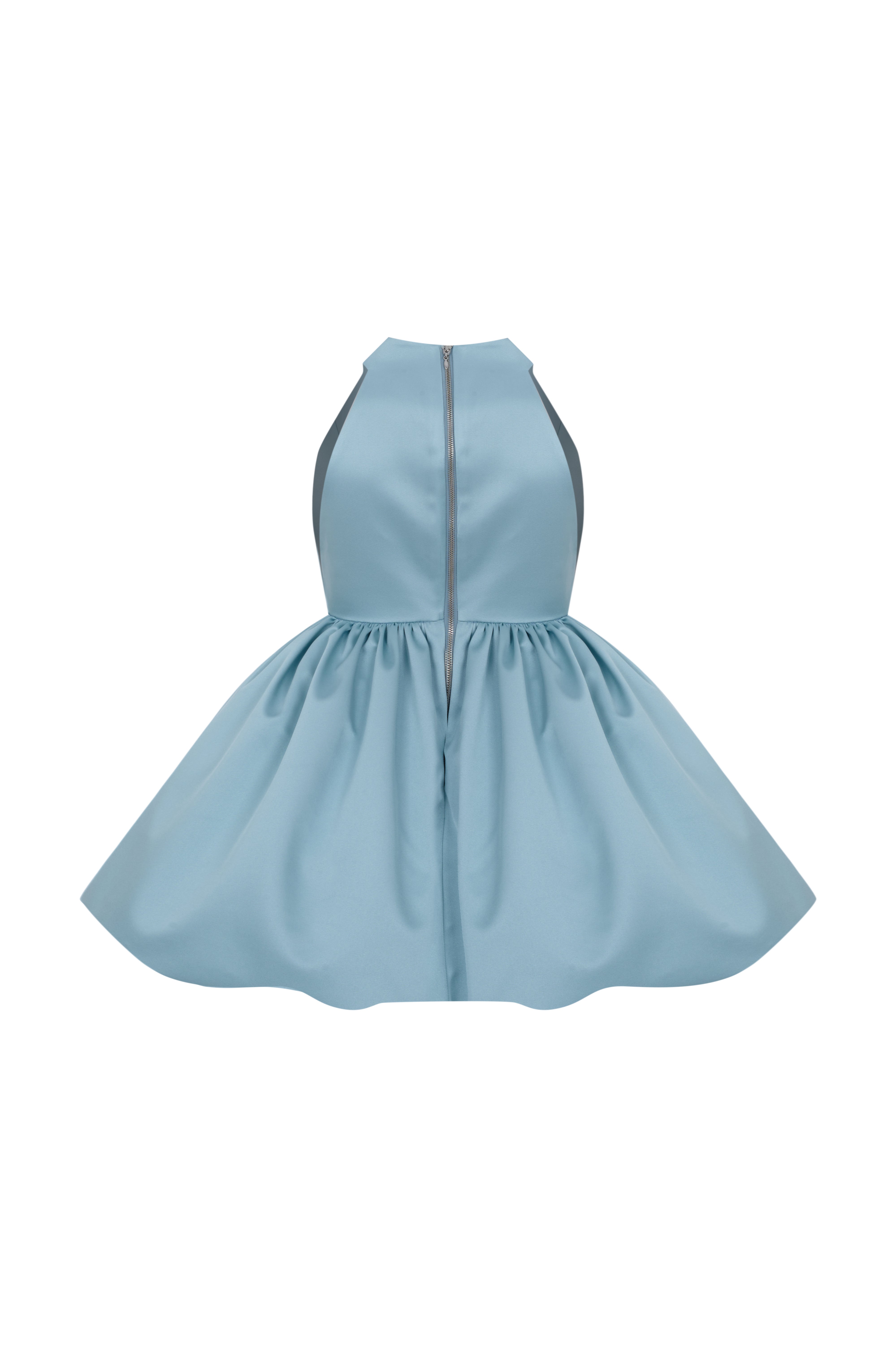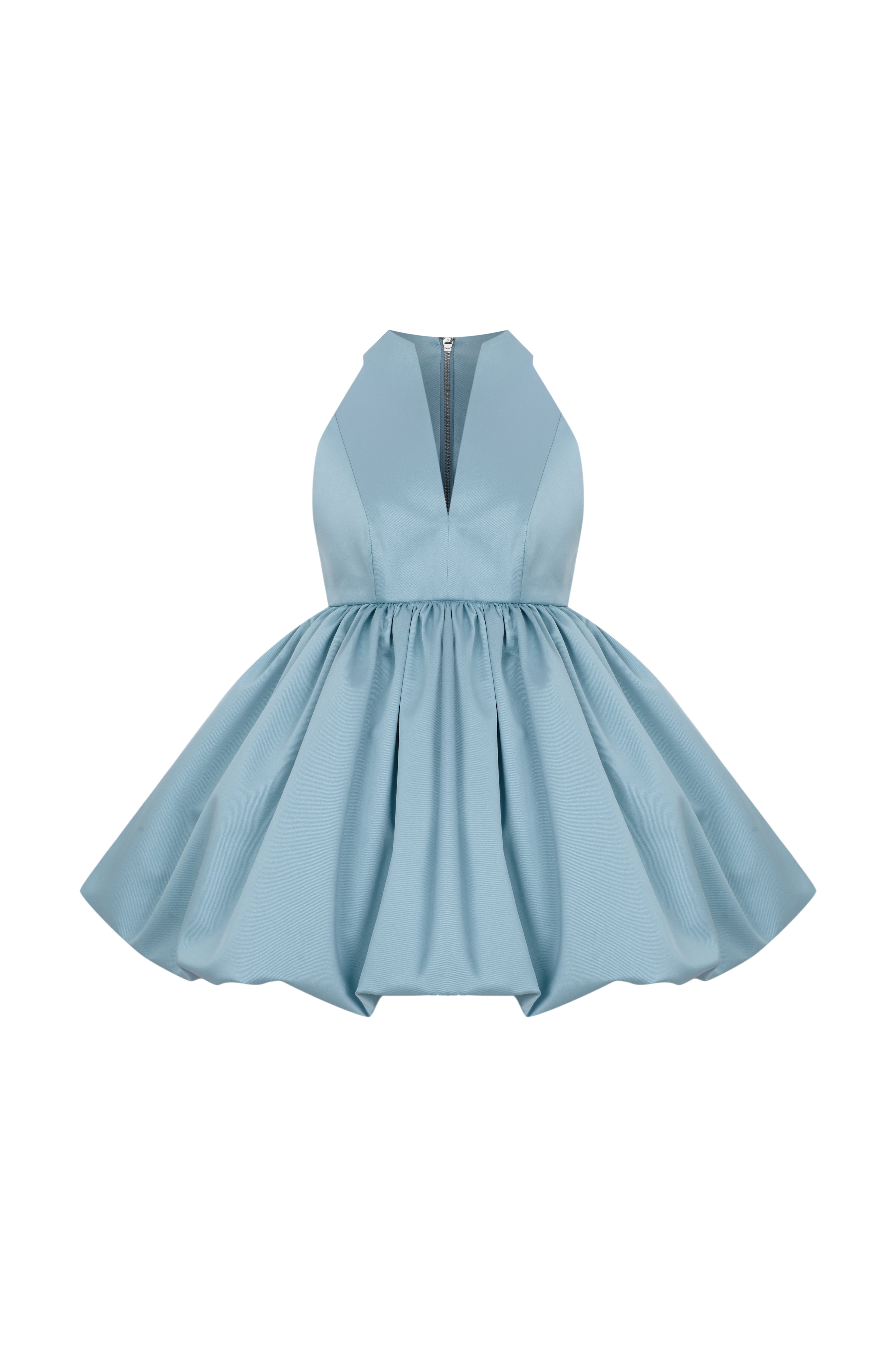 Aqua Void Dress, gücünü geometrinin duygu yüklü dilinden alır. Halter boyun hattının keskin V çizgisi bedende mimari bir hat oluştururken, balon etek bu sertliği zarif bir hacme dönüştürür. Zıtlıktan beslenen, kendine özgü bir denge sunar.