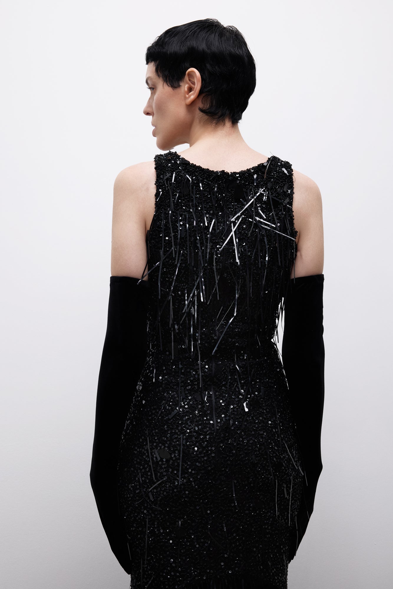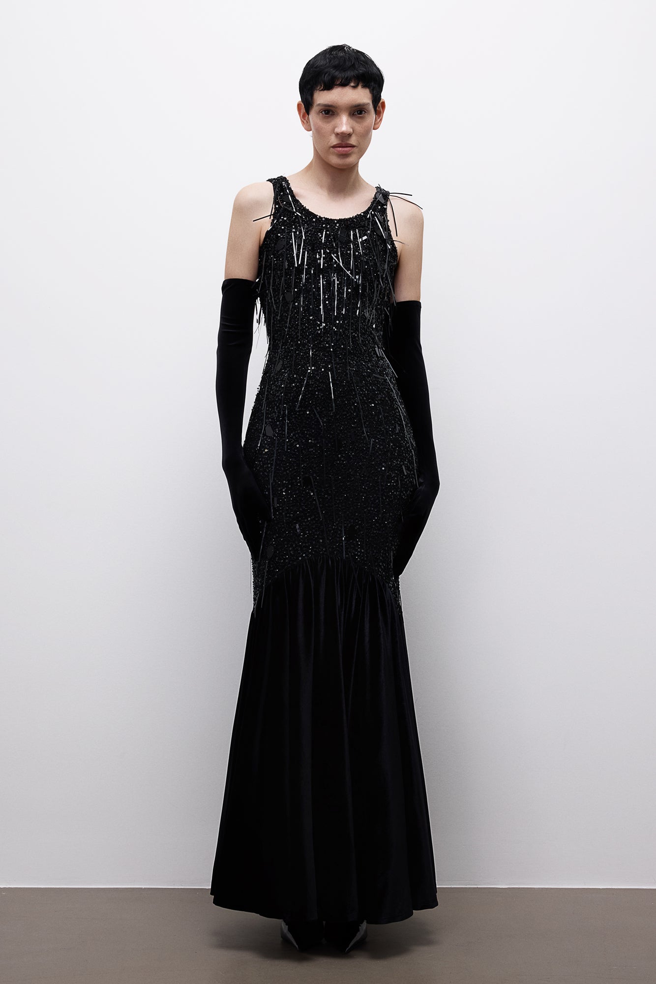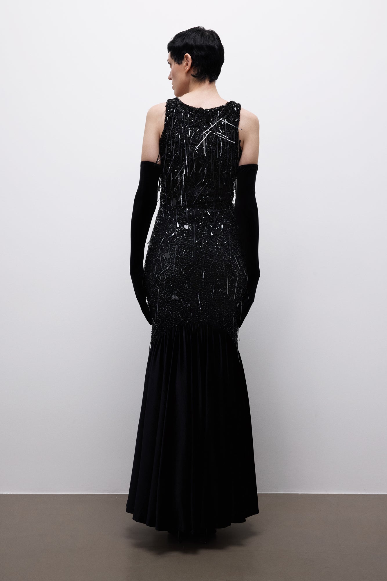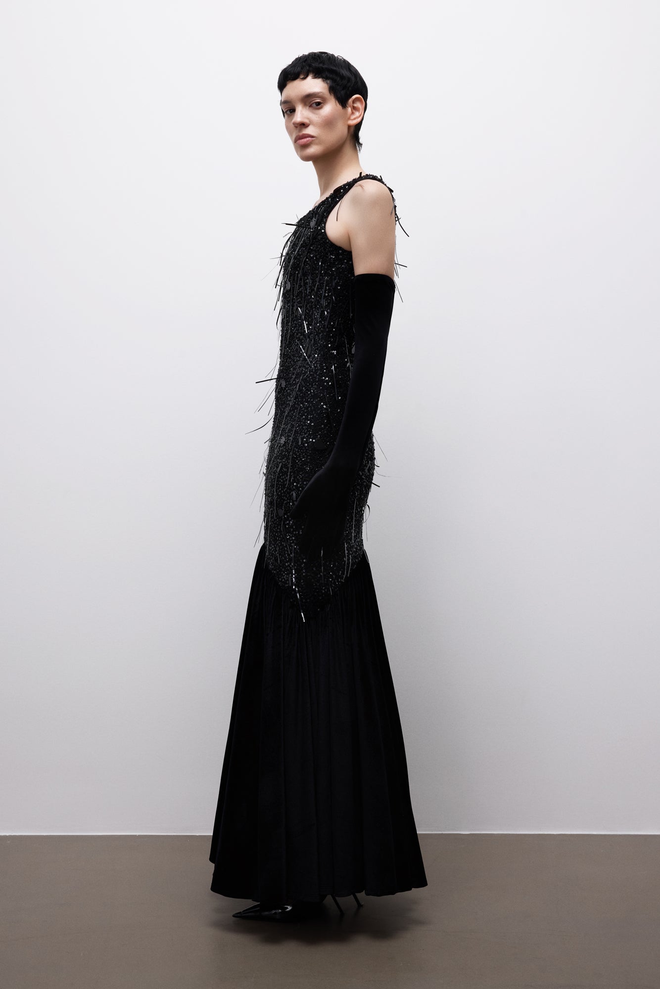 Ashen Covenant Dress, sessizlikte kurulan bir yemini temsil eder. Metalik çizgisel işlemelerle bölünen koyu ve heykelsi silueti, küle dönüşen ışık hissi yaratır.
