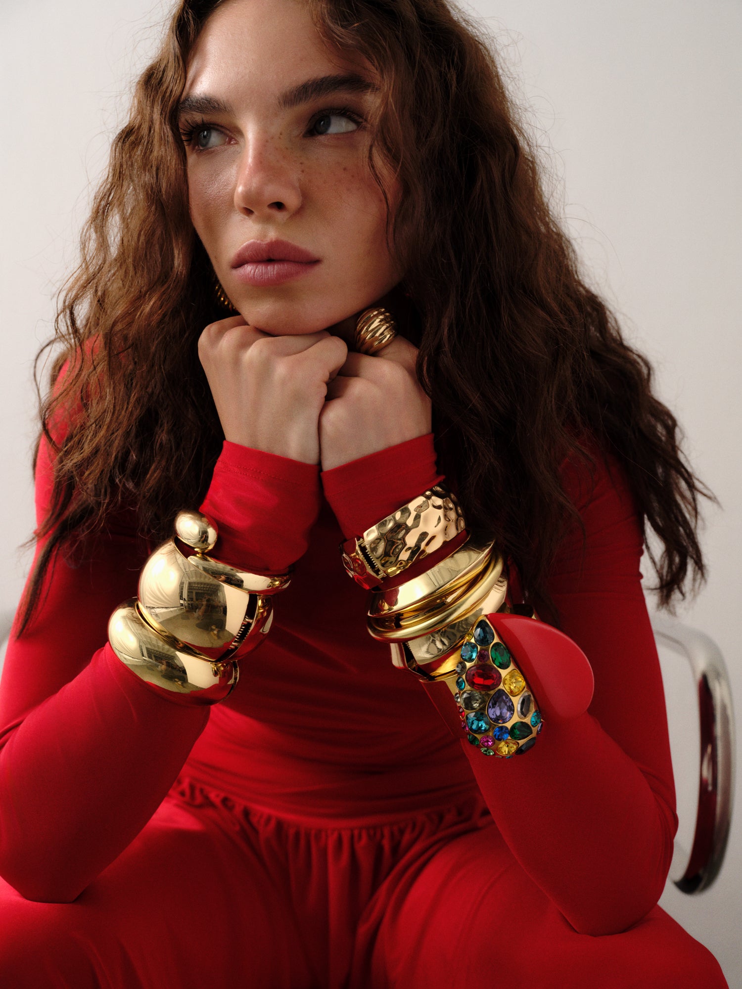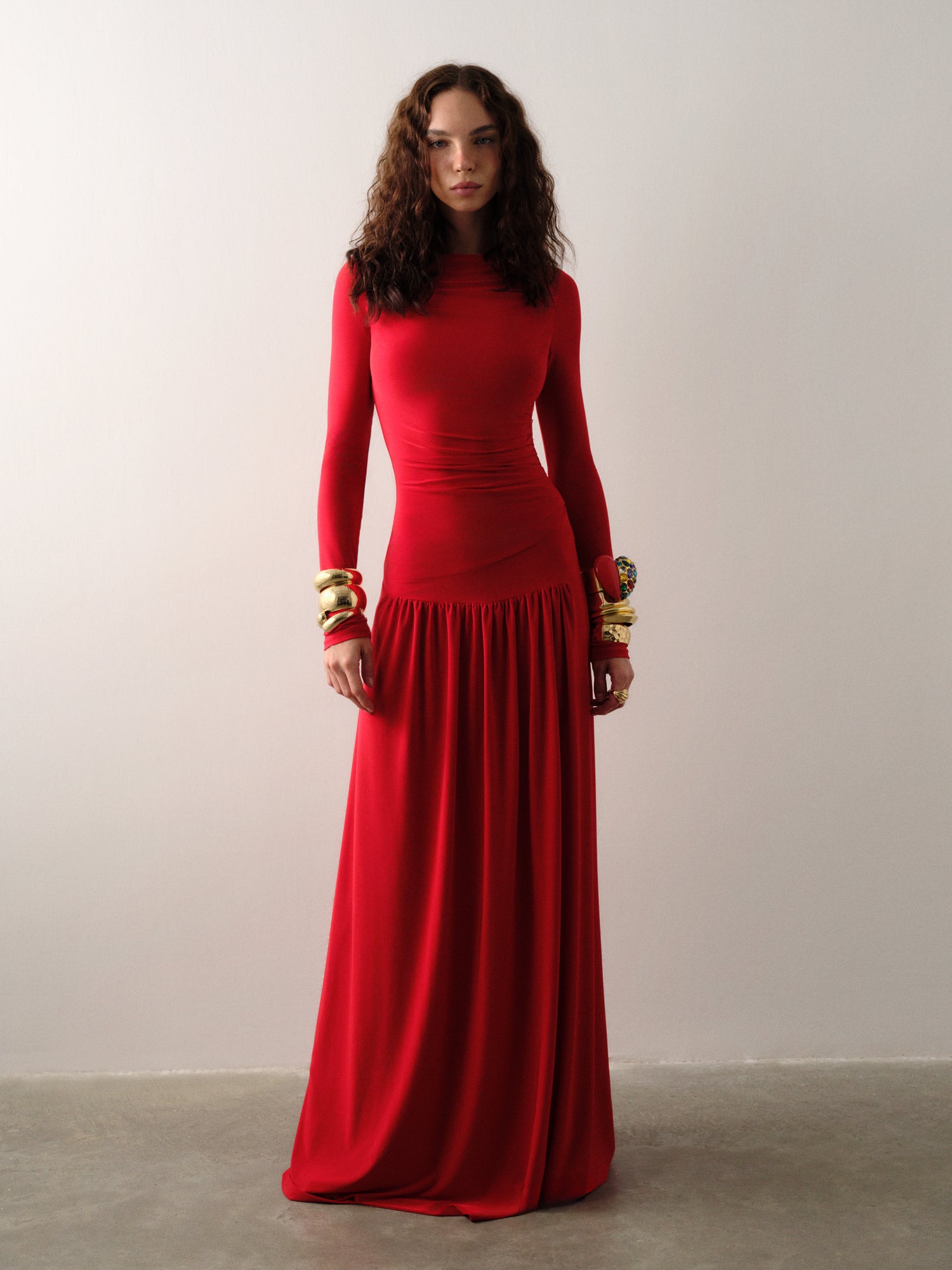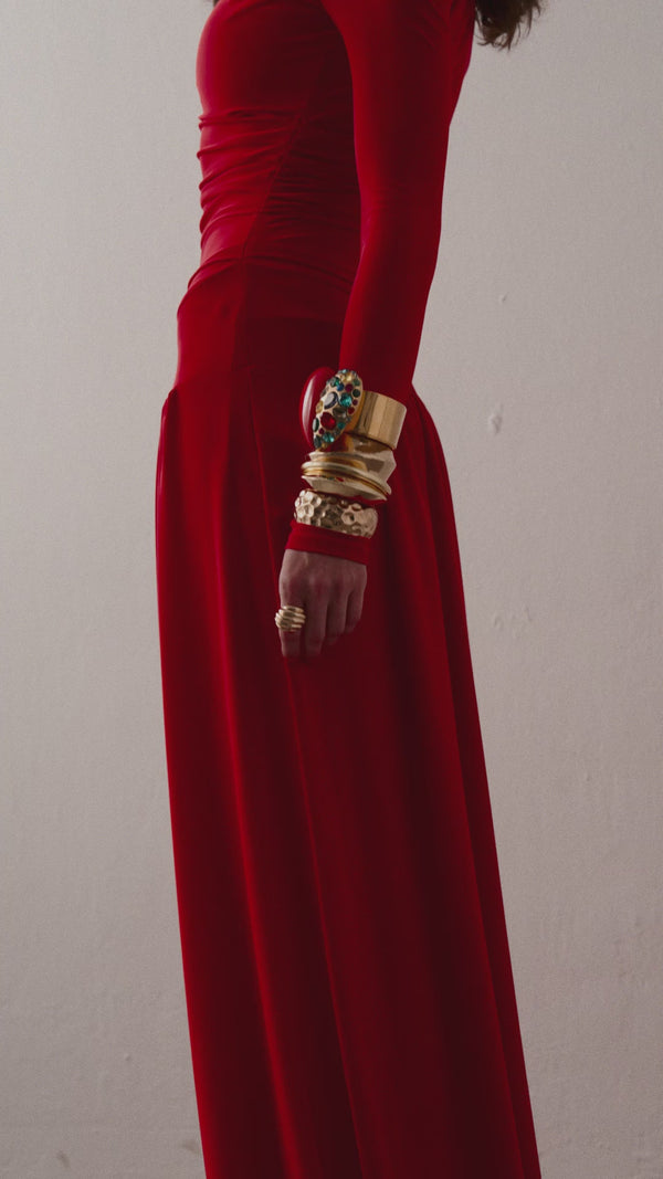 Toplanmış bel ve akıcı eteğe sahip zamansız kırmızı