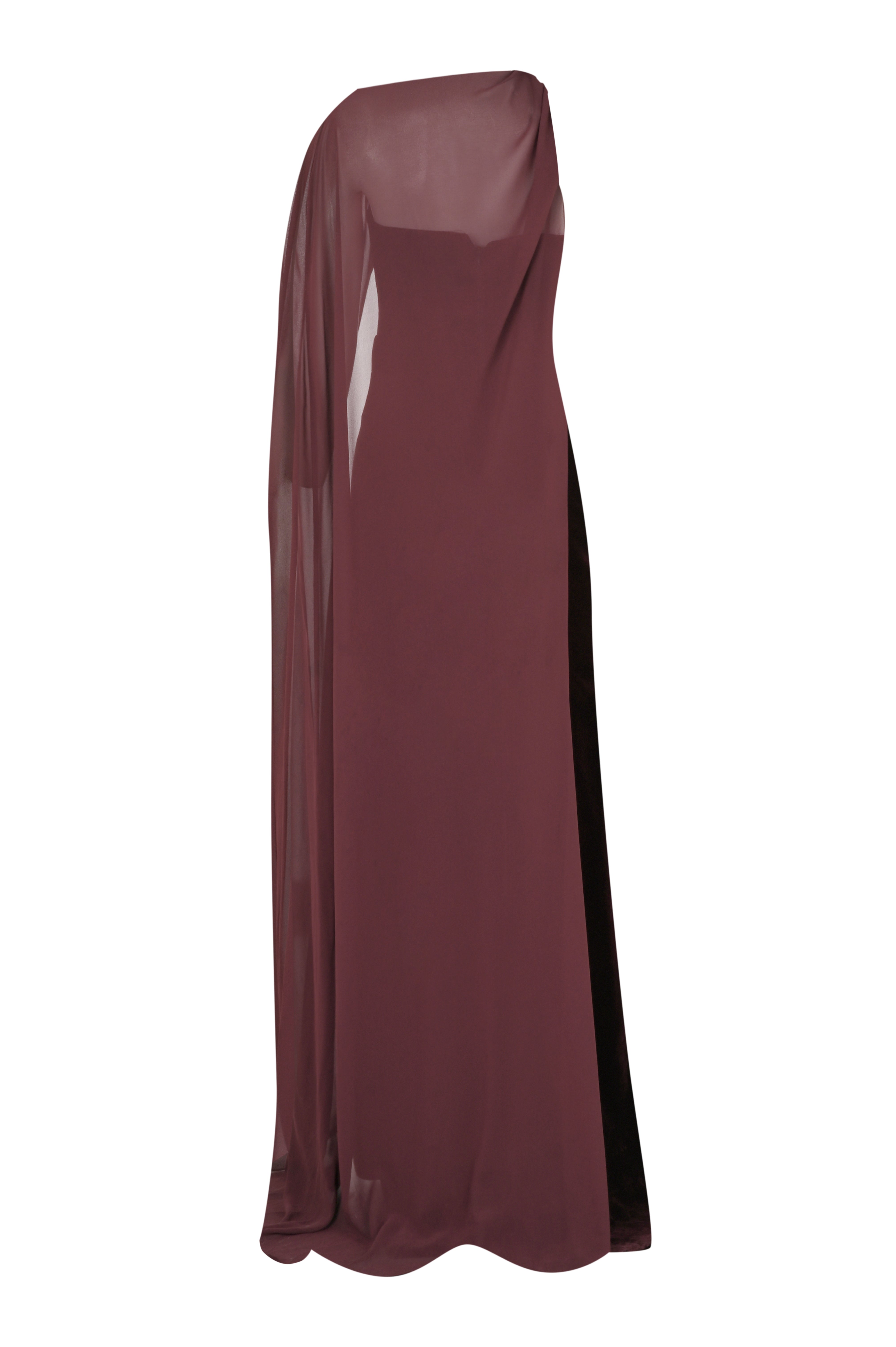 Burgundy Aura, kadife dokusu ve tek omuzdan dökülen şifon cape detayıyla zarafeti en dramatik haliyle sunar. Strapless corset formu vücudu kusursuz biçimde sararken, akıcı cape tasarımı elbiseye güçlü ve akılda kalan bir siluet kazandırır.