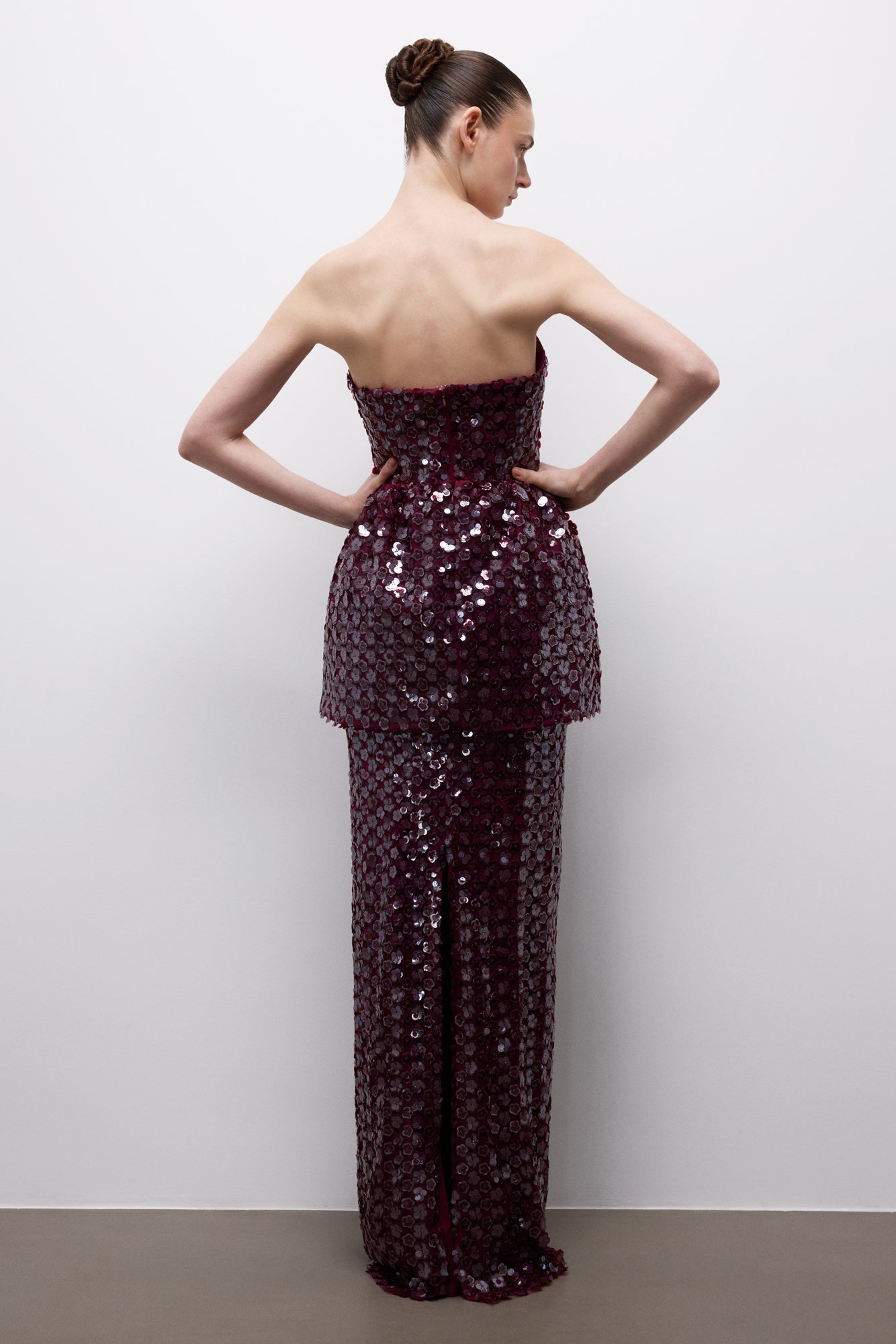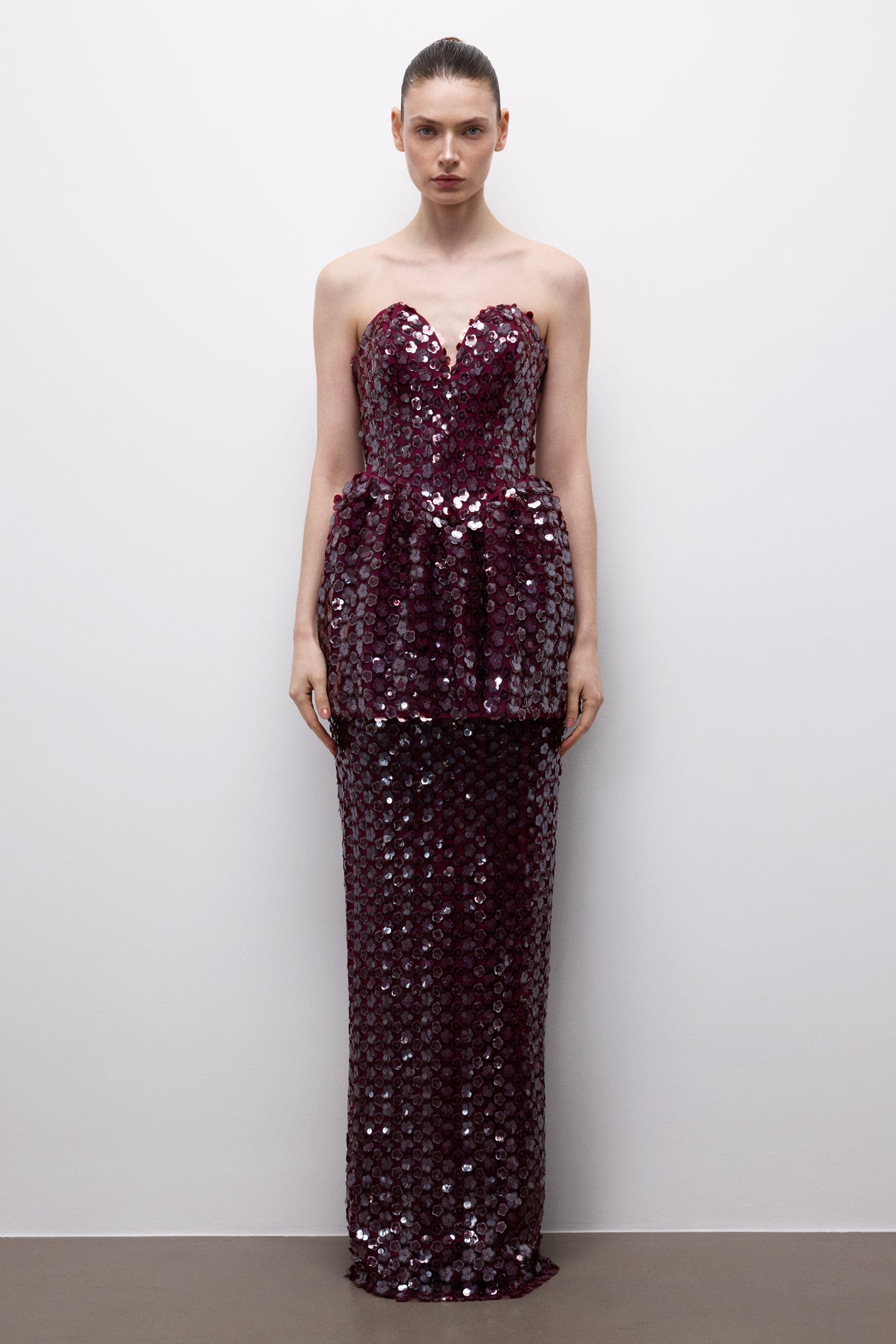 Katmanlı payet yapısı ve straplez formuyla dramatik bir hacim sunar.