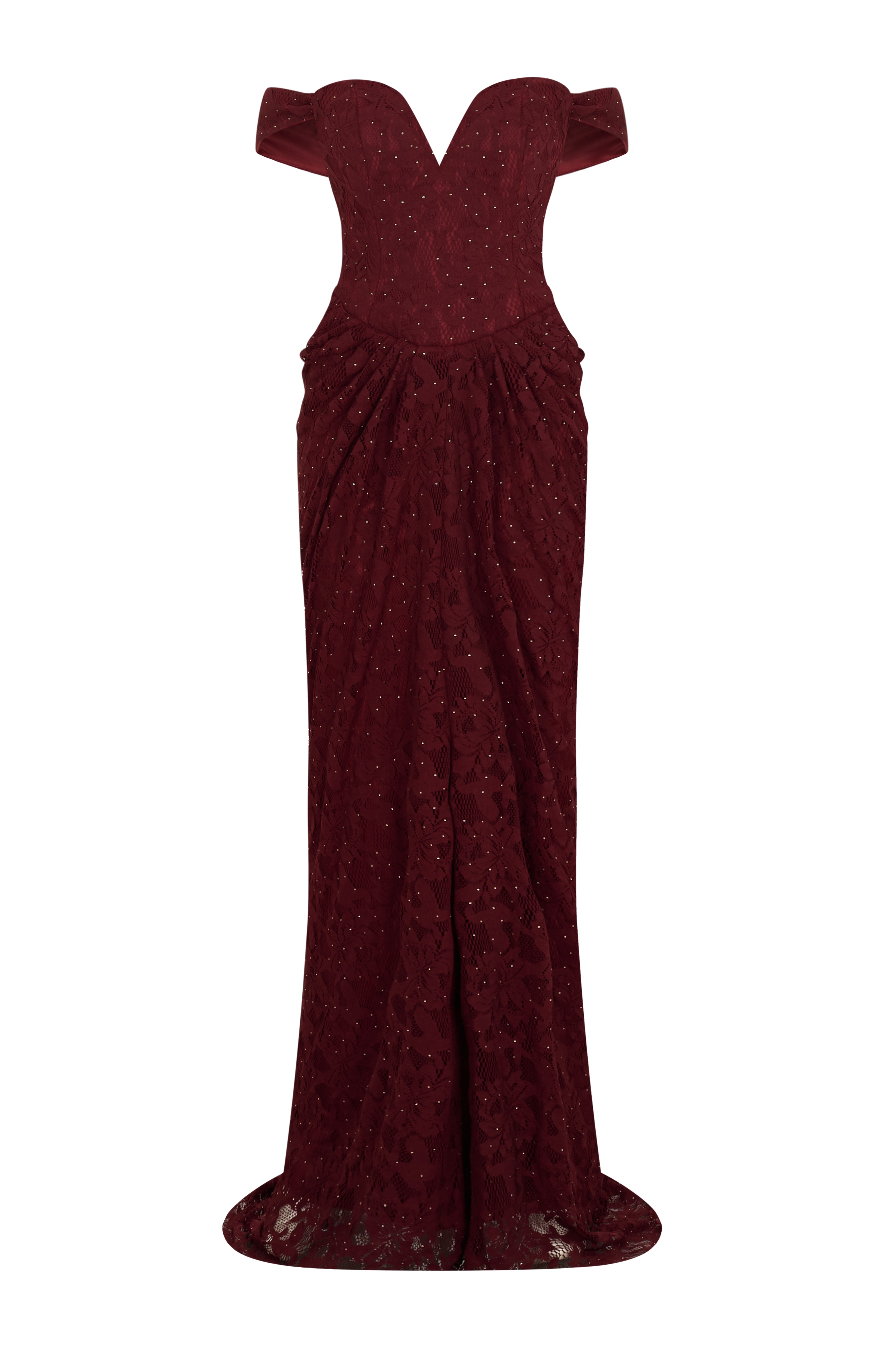 Crimson Stardust Gown, ışıltılı işlemeli dantel dokusu ve off-shoulder yaka formuyla dramatik bir gece şıklığı sunar. Drapeli etek tasarımı ve kuyruk detayları, elbiseye asil ve göz alıcı bir siluet kazandırır.