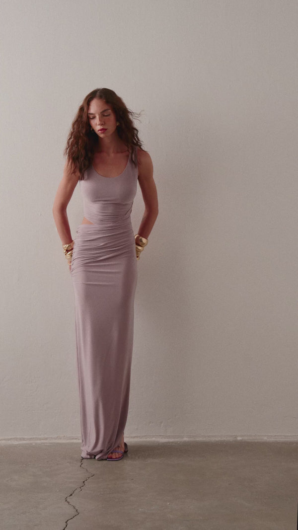 Bel kısmı kesim detaylı, lila tonlarında kolsuz vizyon