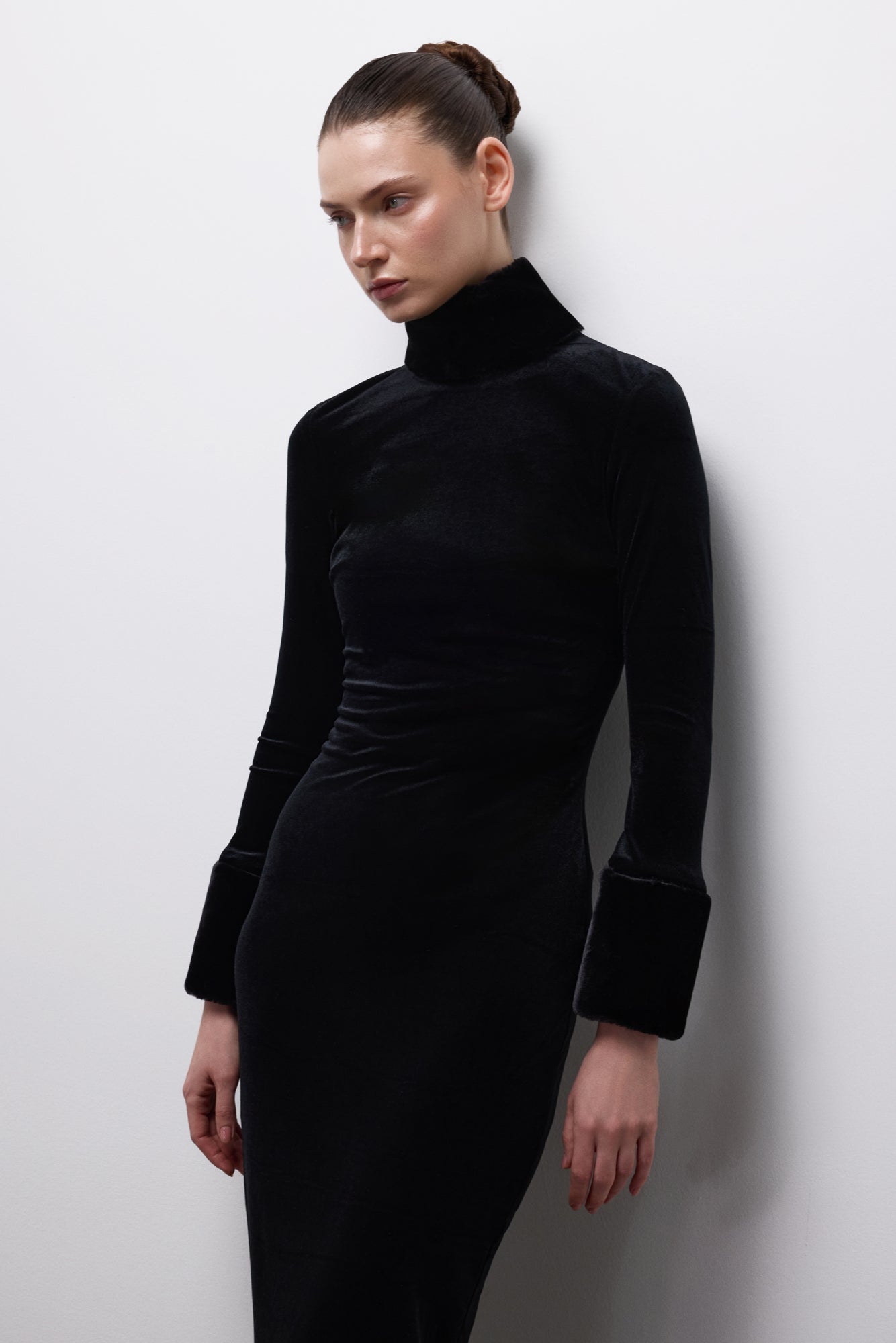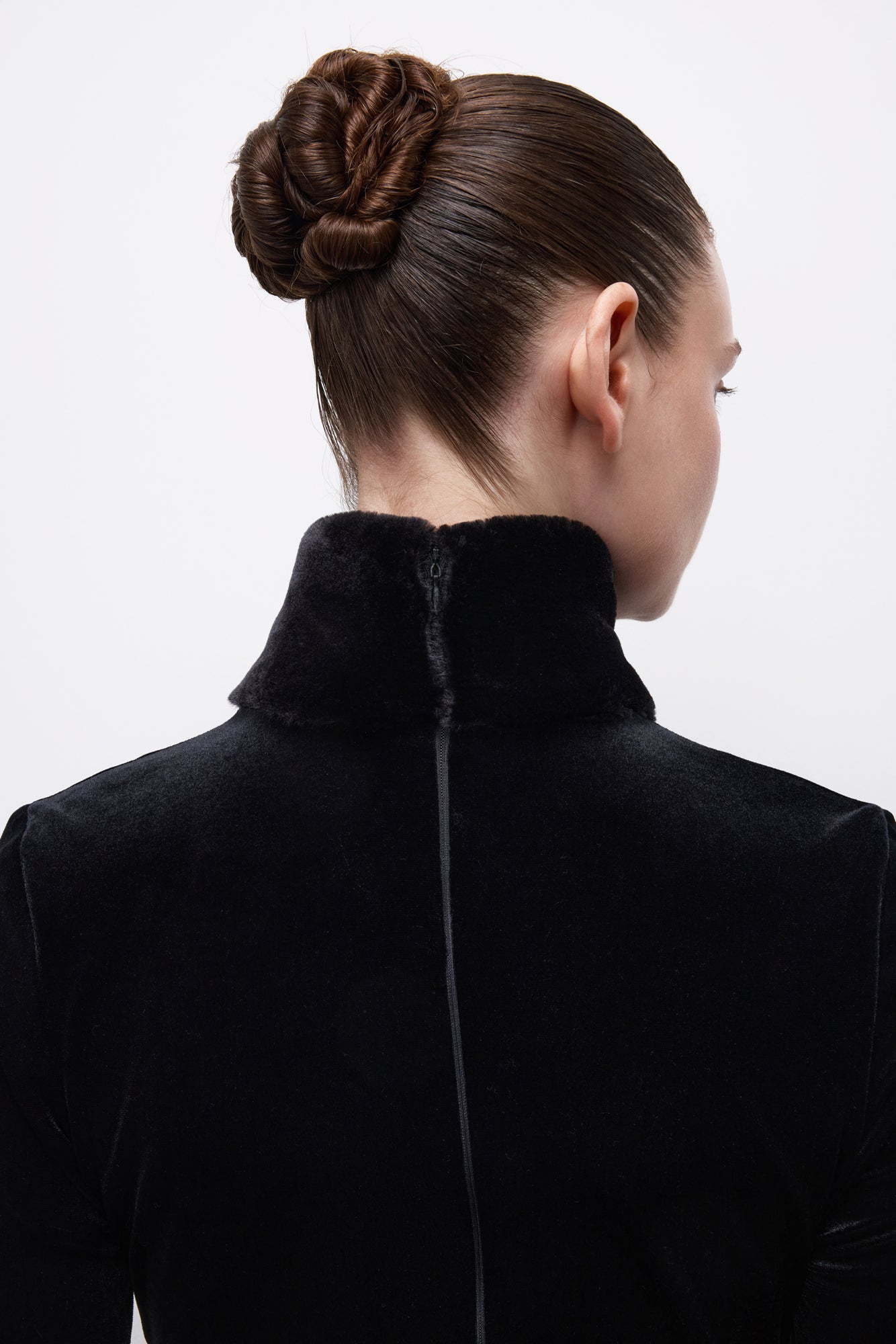 Kadife dokusu ve yüksek yakasıyla sade ama güçlü bir duruş sergiler.