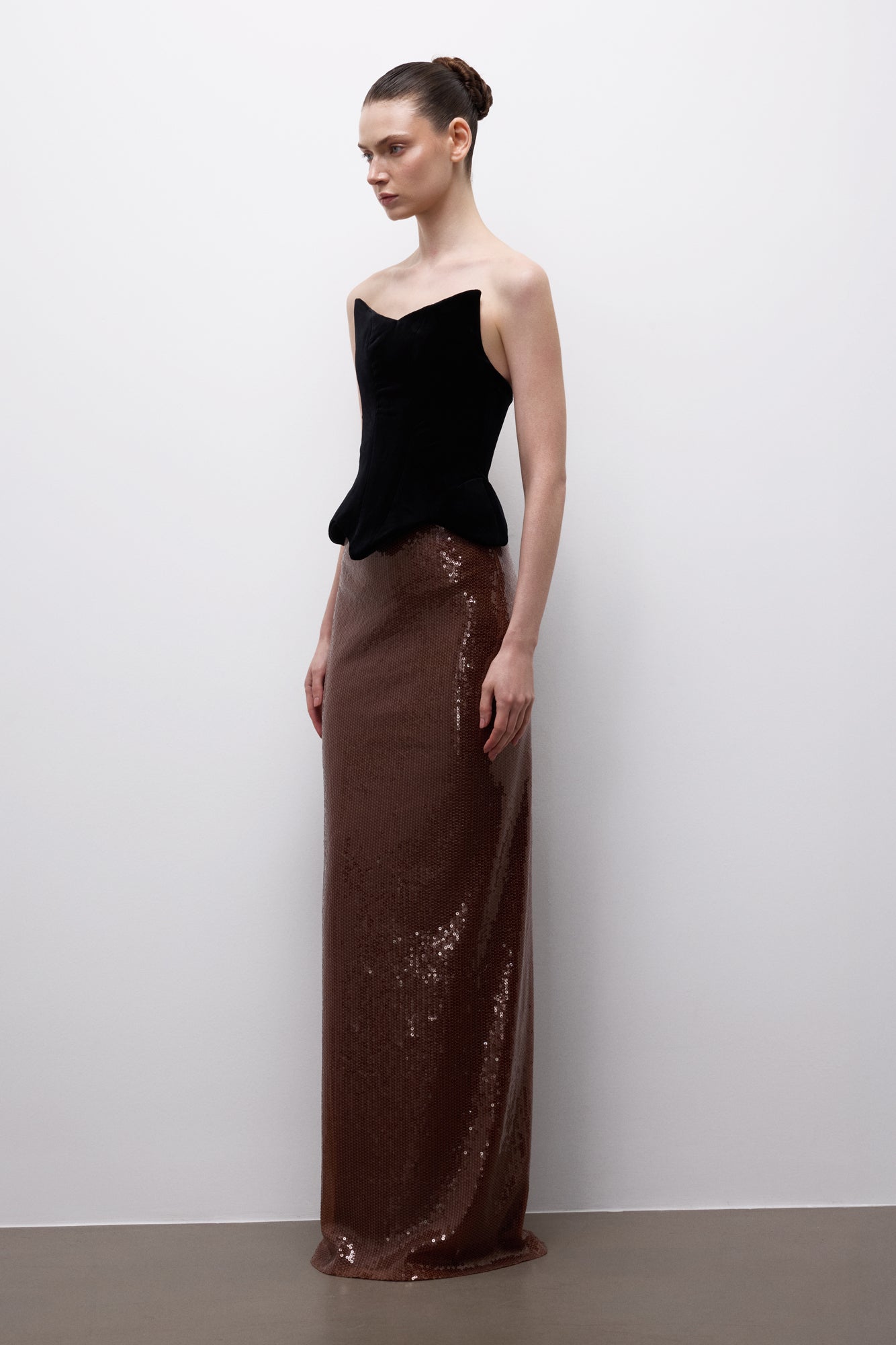 Noctyra Form Dress, mimari bir üst form ile akışkan dokunun güçlü karşıtlığını bir araya getirir. Straplez, yapılandırılmış siyah üst beden net hatlarla vücudu sararken; bronz payet etek, yere kadar uzanan kontrollü bir akış sunar. Güçlü ama sade bir duruş arayanlar için modern ve iddialı bir gece silueti yaratır.