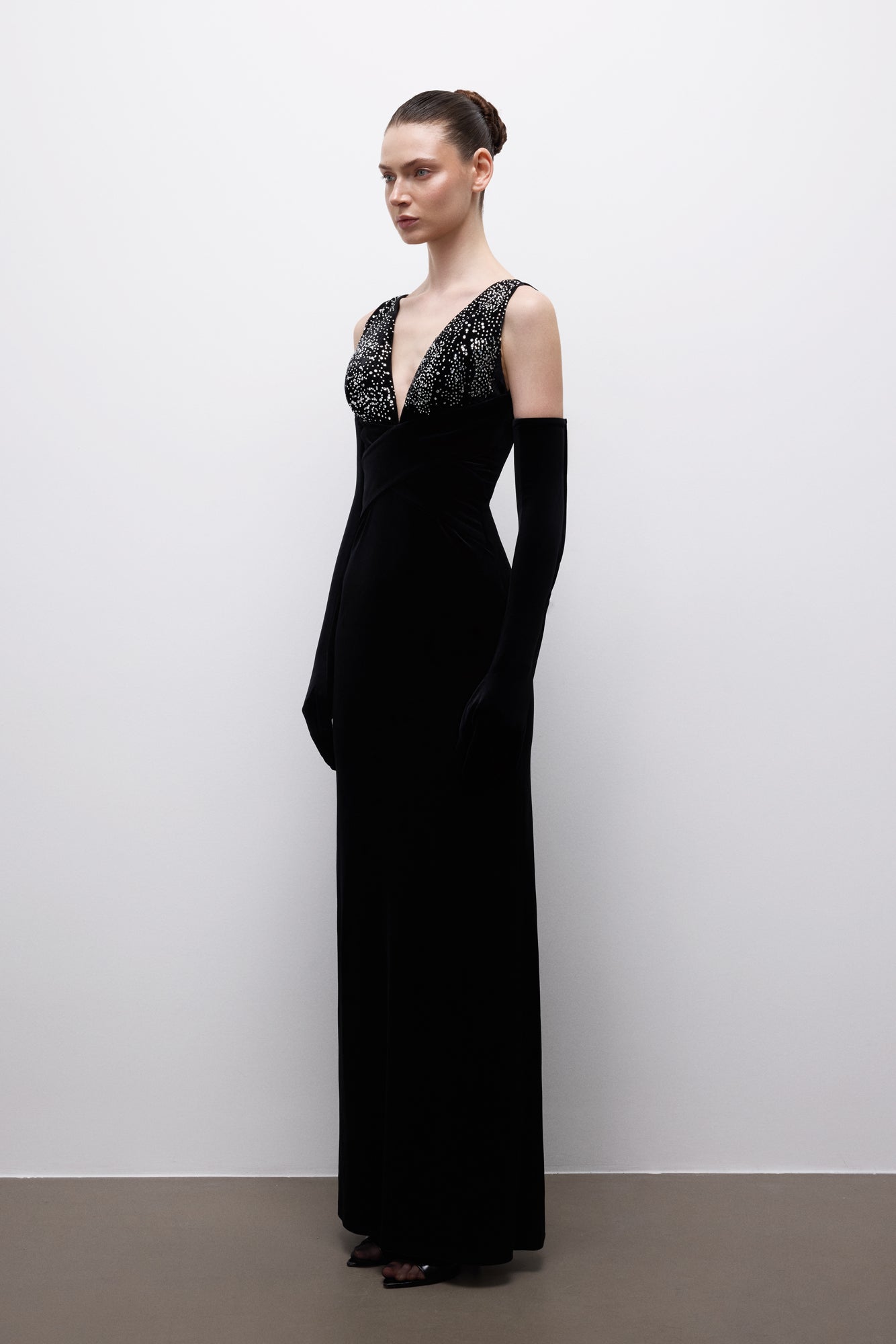 Derin V yakası ve zarif taş detaylarıyla dengeli ve güçlü bir duruş sunar.