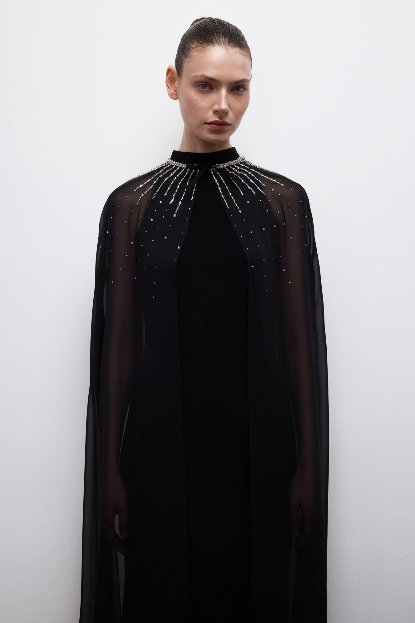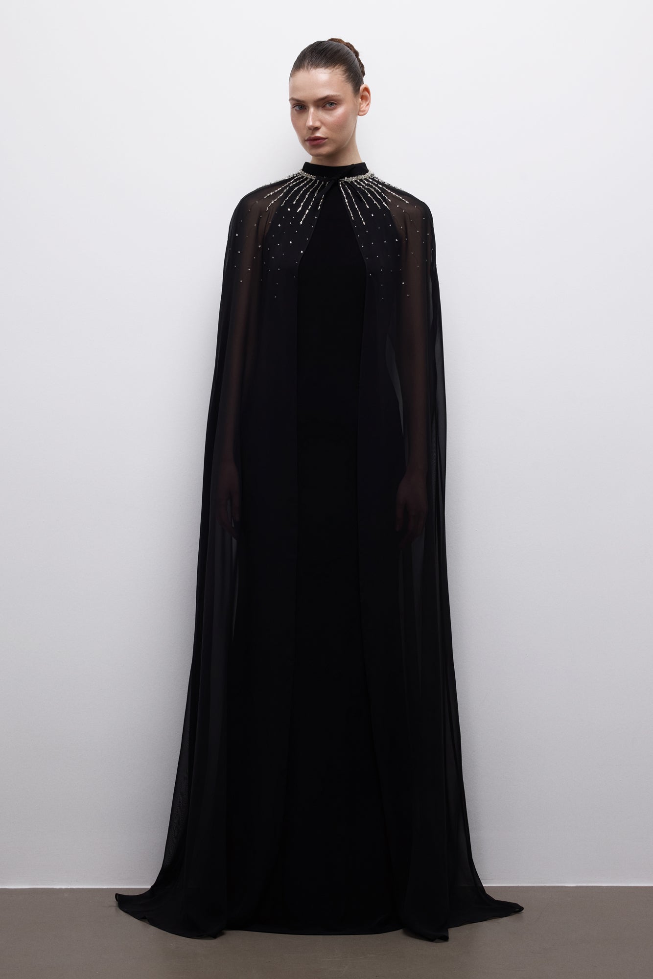 Şeffaf cape detayı ve ışık yansıtan yaka süslemesiyle akışkan ve güçlü bir siluet sunar.