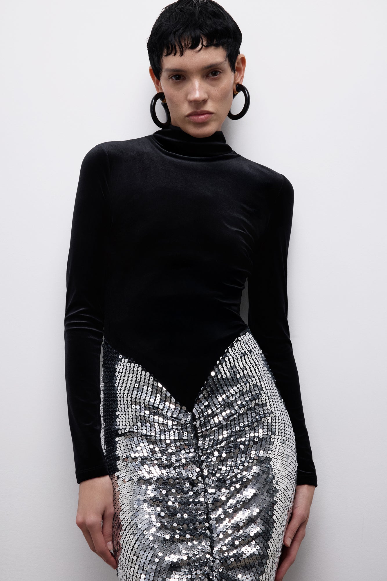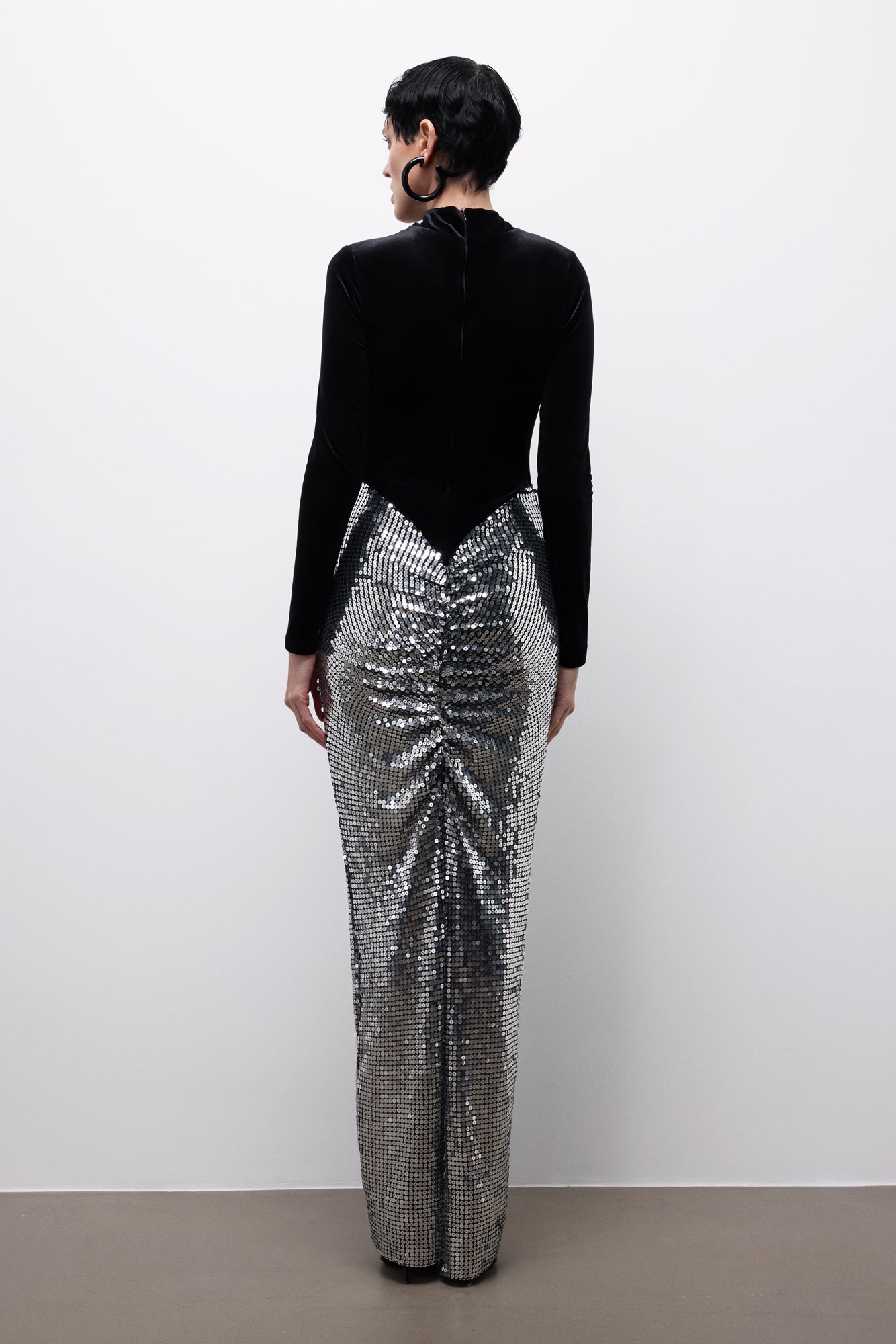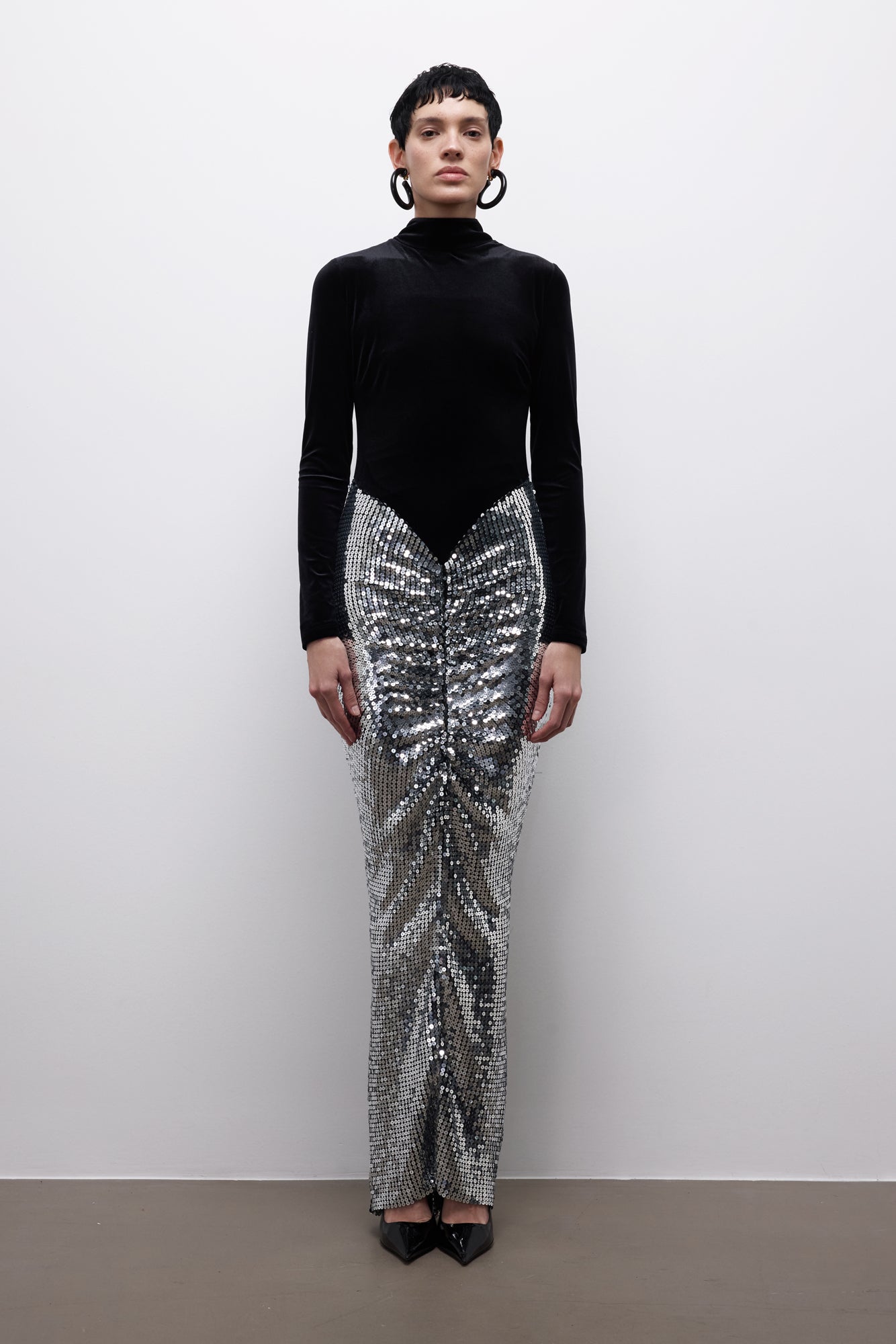 Uzun kollu ve yüksek yakalı tasarımı, payet etekle güçlü bir kontrast oluşturur.
