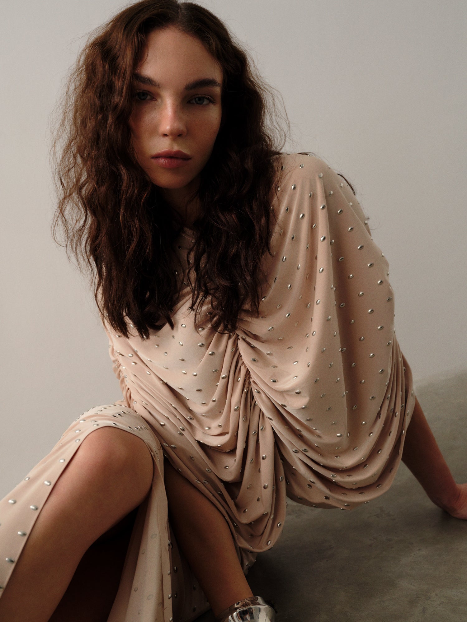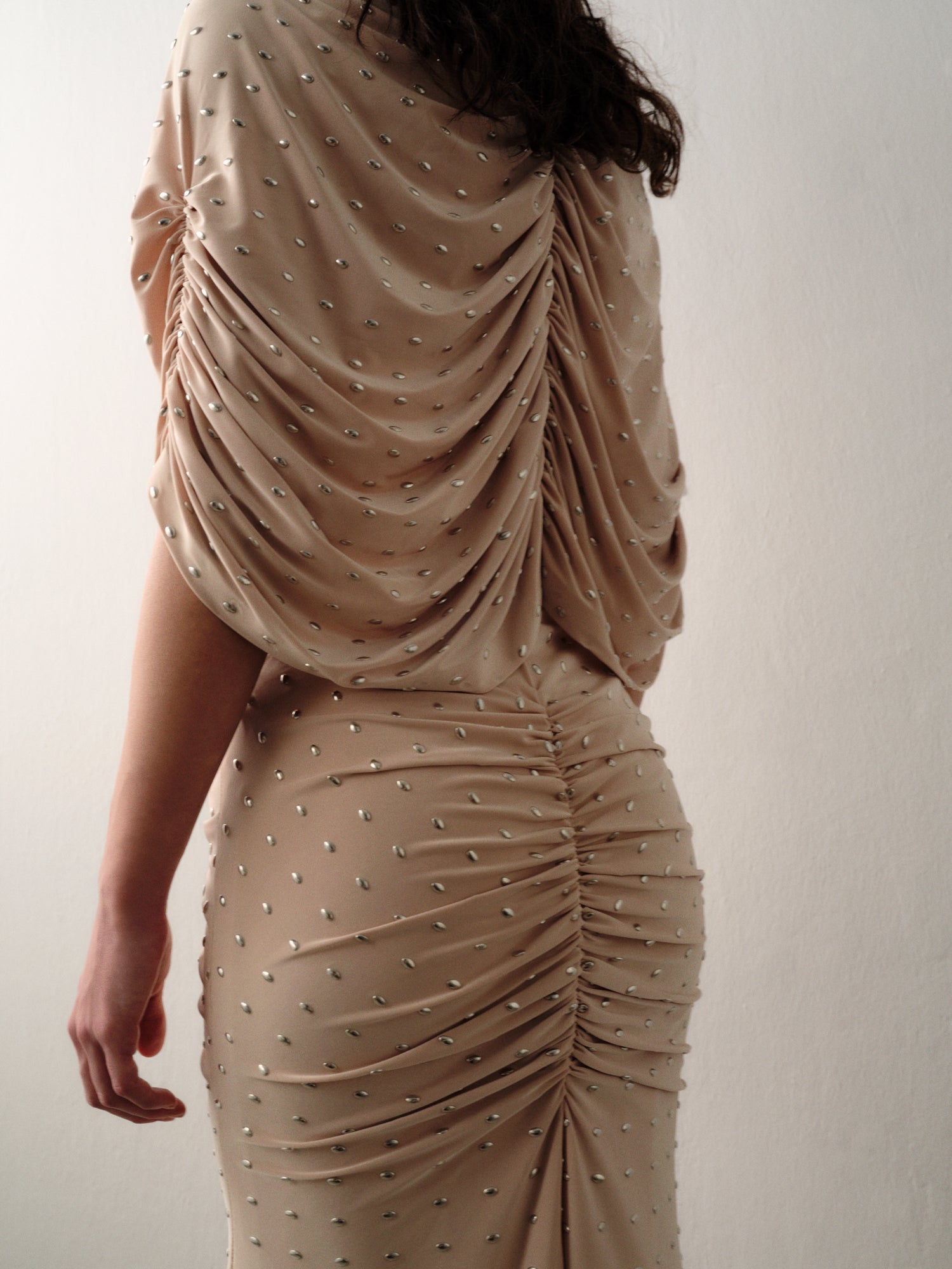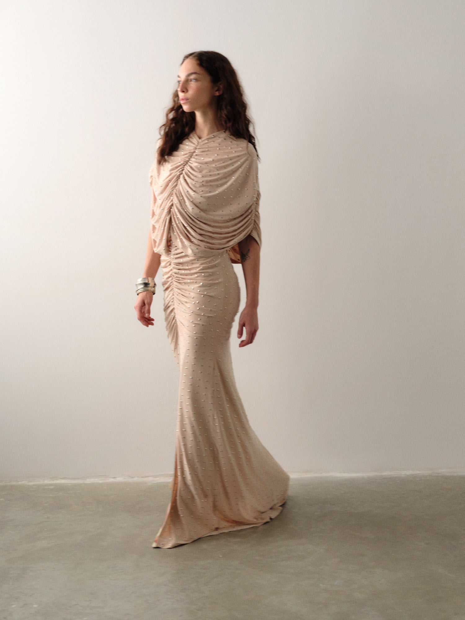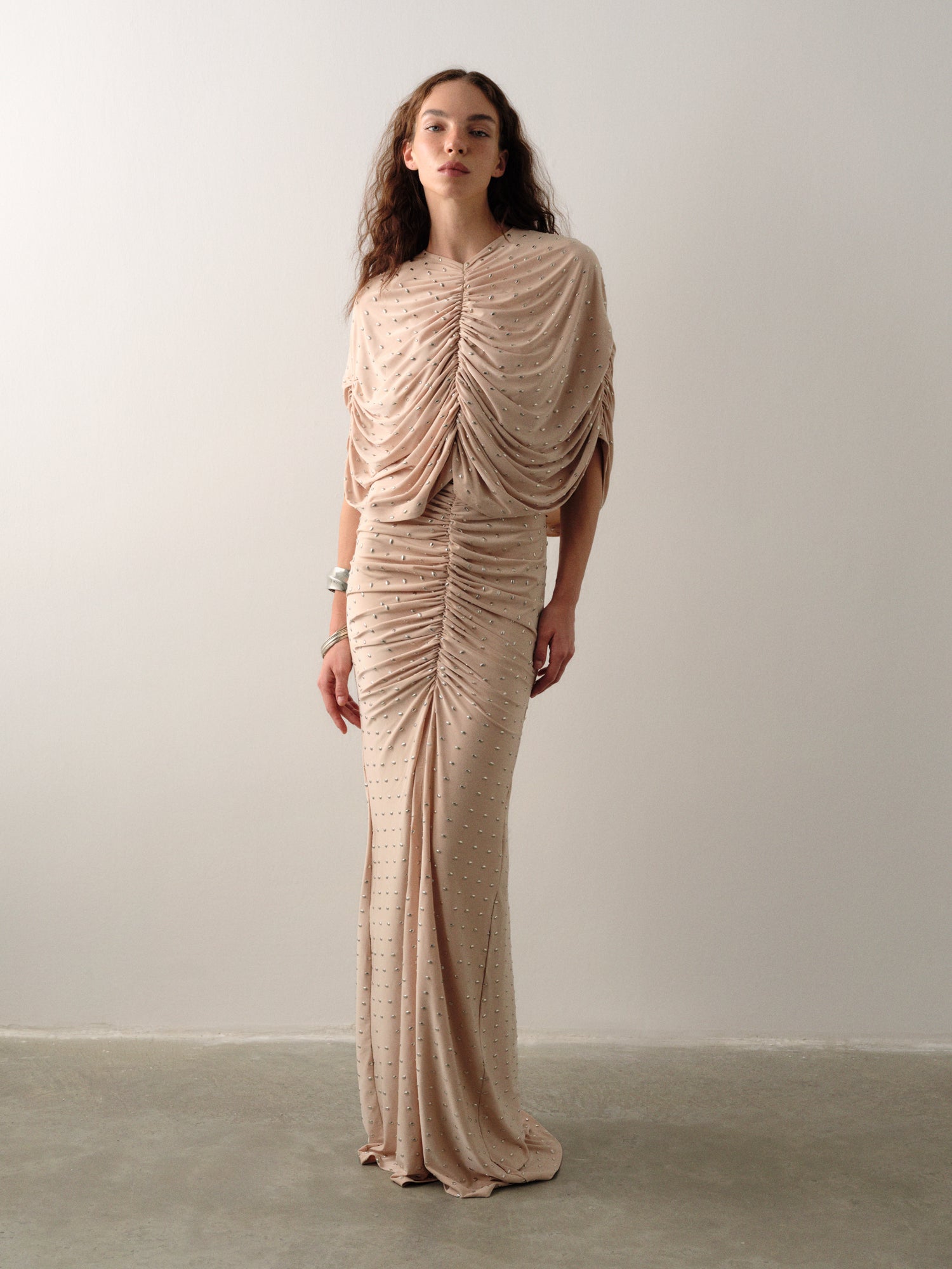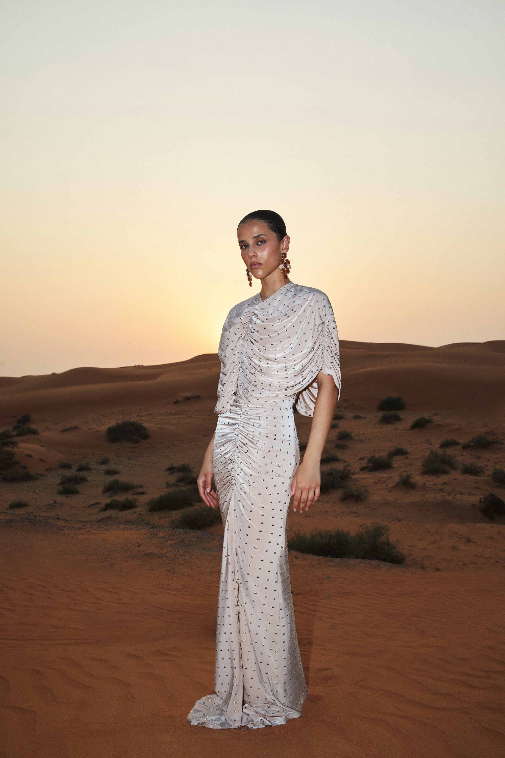 Fildişi tonlarında modern zarafet. Yüksek yaka drape detaylarla birleşiyor, yan yırtmaç ve inci esintili süslemelerle tamamlanıyor.