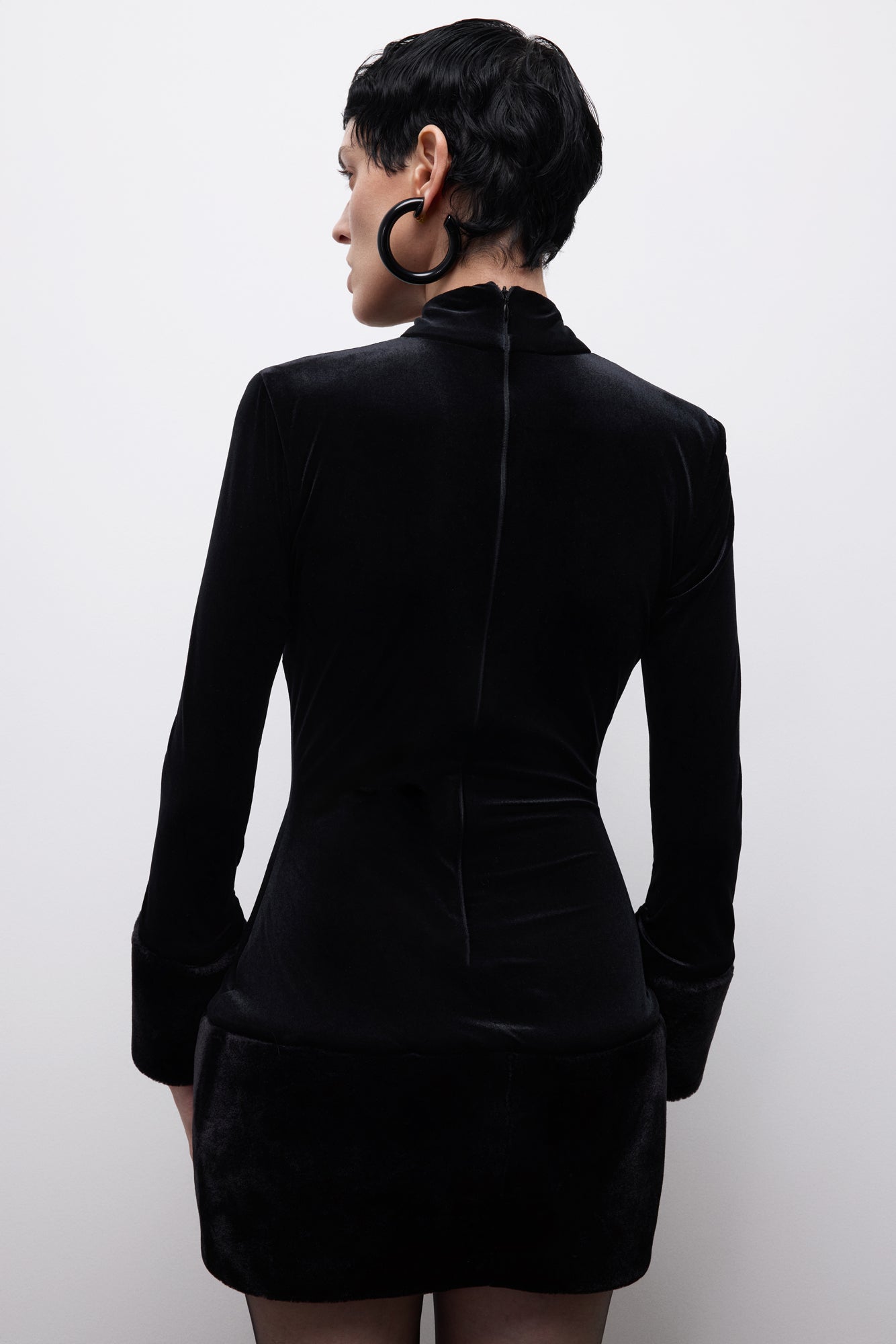 Mini boyu ve manşet detaylarıyla törensel ve iddialı bir görünüm sunar.