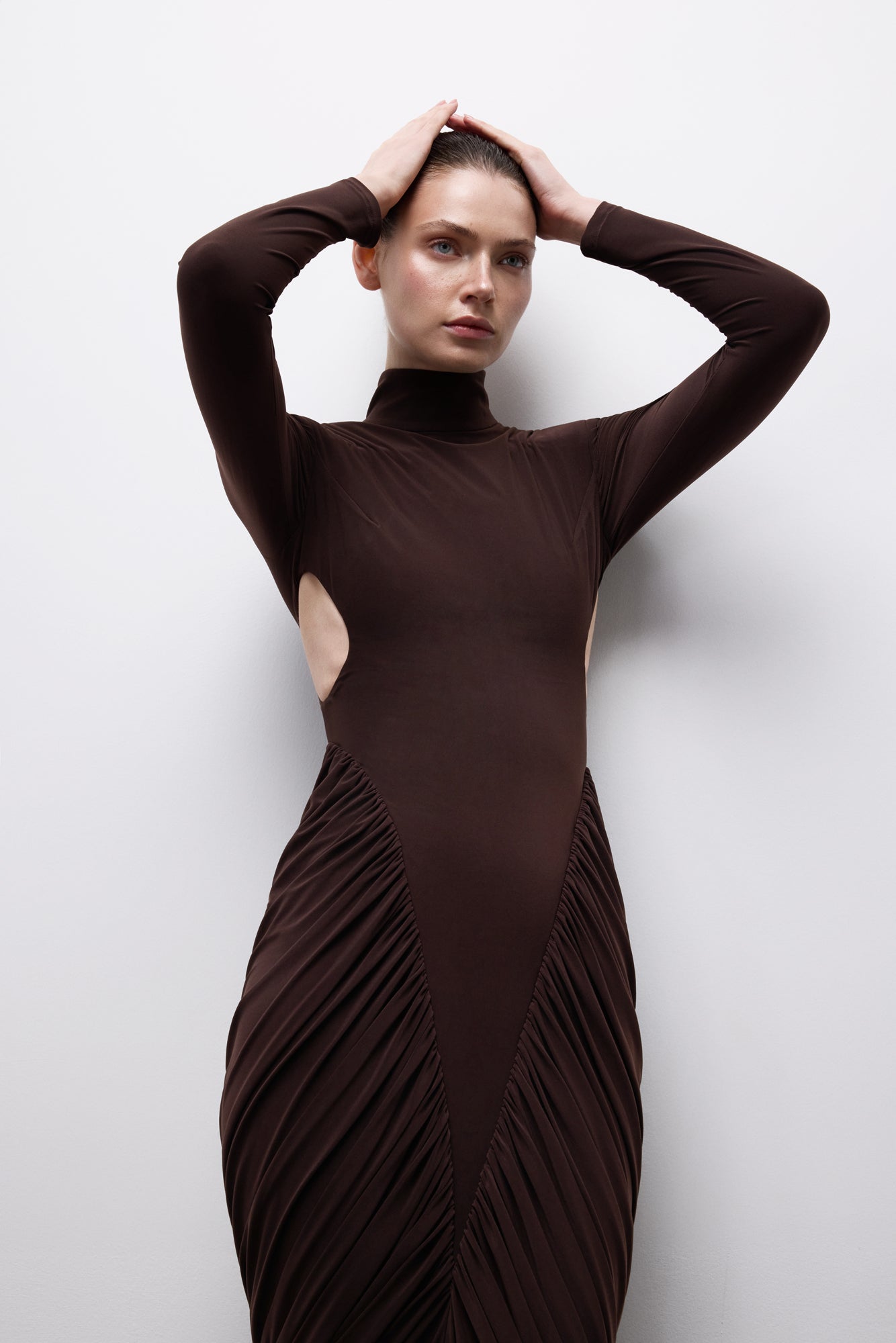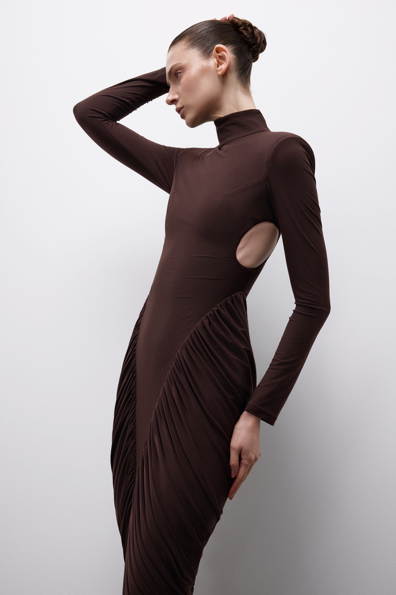Yüksek yakası, yan cut-out detayları ve pliseli panelleriyle heykelsi bir duruş sunar.