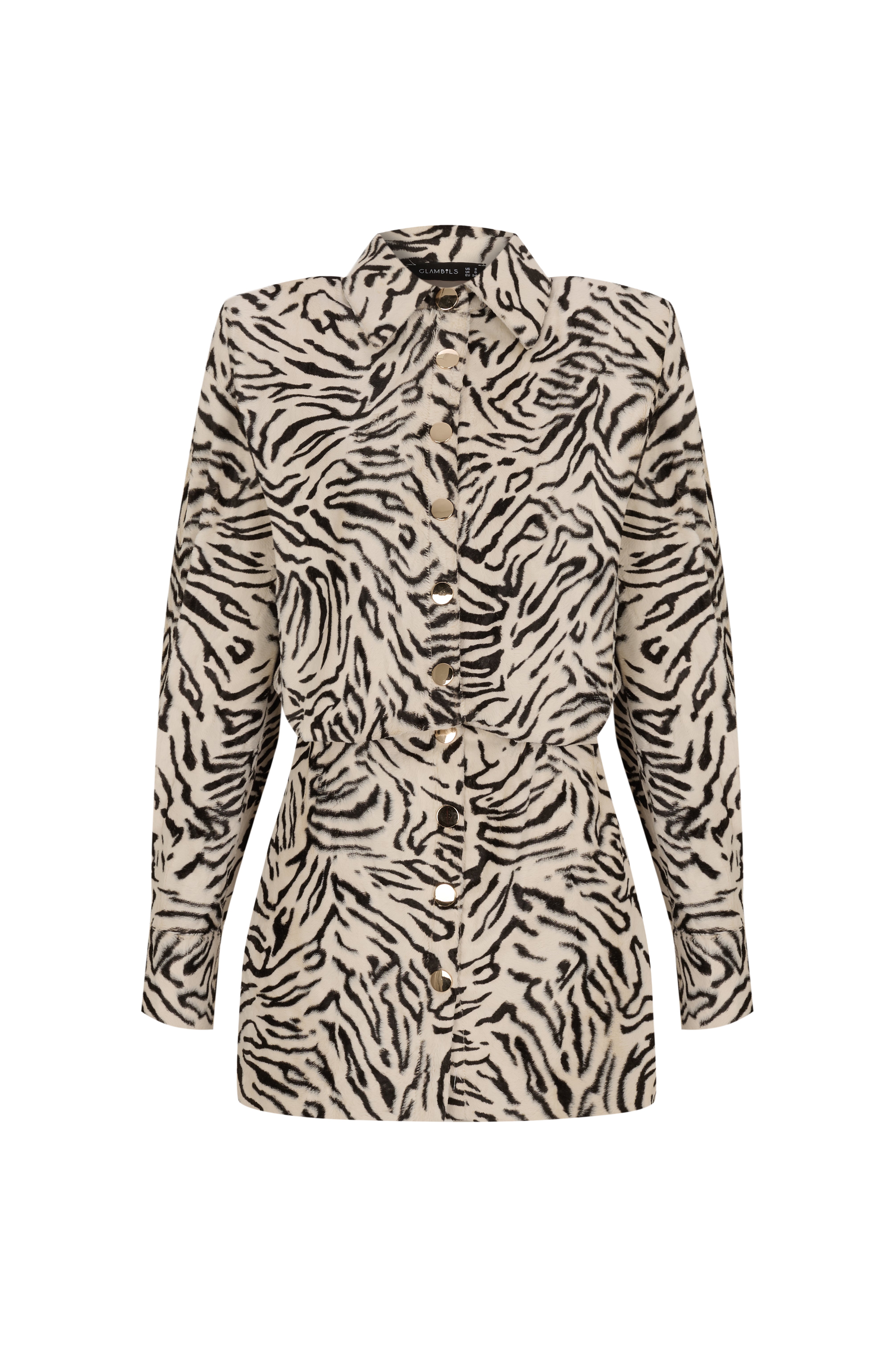 Sahara Stripe Shirt Dress, zebra deseniyle modern bir safari şıklığı sunar. Bel formunu ortaya çıkaran yapısı ve altın düğmeleriyle güçlü ve feminen bir duruş yaratır.
