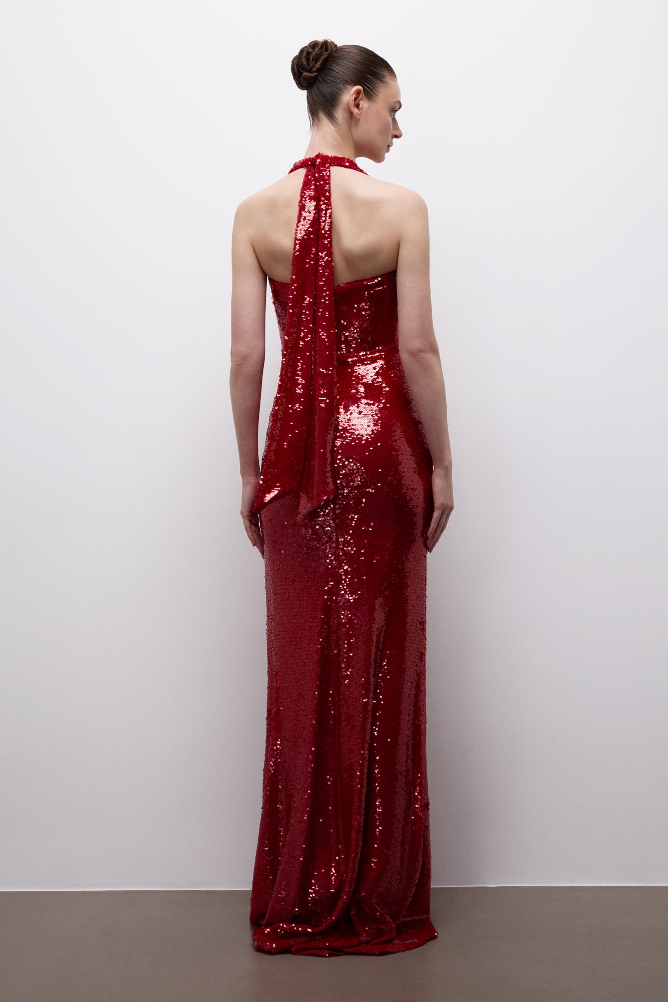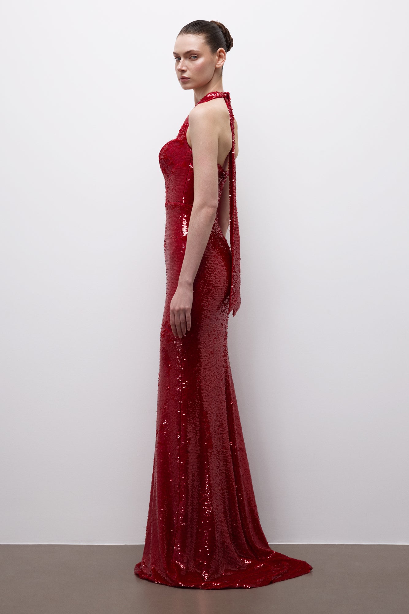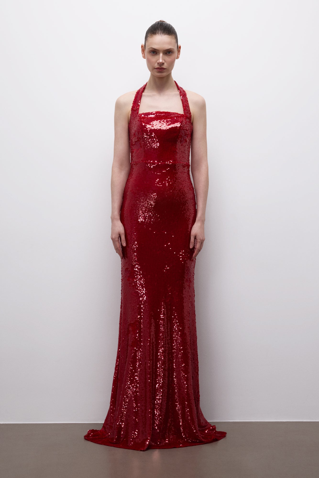 Halter yaka formu ve payet dokusuyla net, güçlü ve dengeli bir siluet oluşturur.