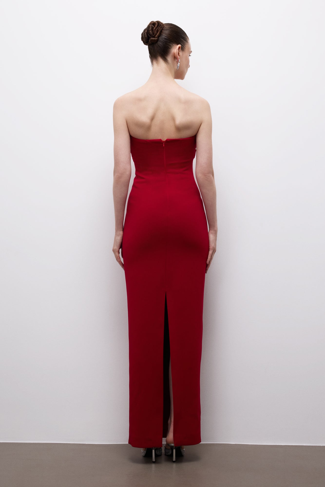 Straplez formu ve sade hatlarıyla zamansız bir zarafet sunar. Güçlü, net ve sofistike bir siluet yaratır.