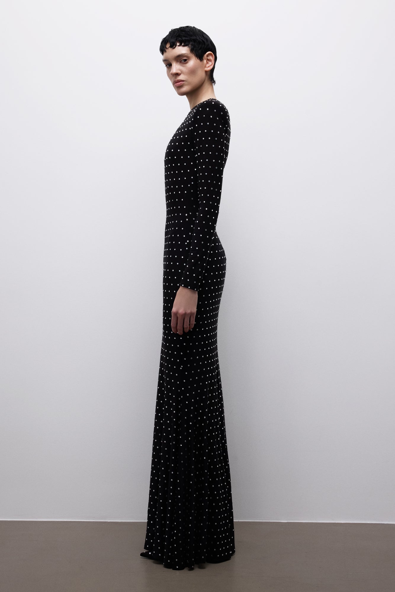Tüm yüzeye yayılan minimal taş detaylarıyla net ve kontrollü bir duruş sergiler.