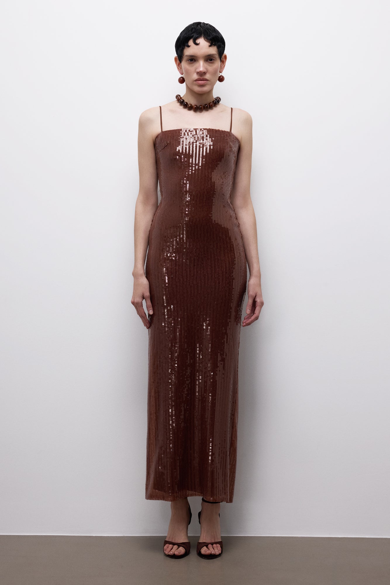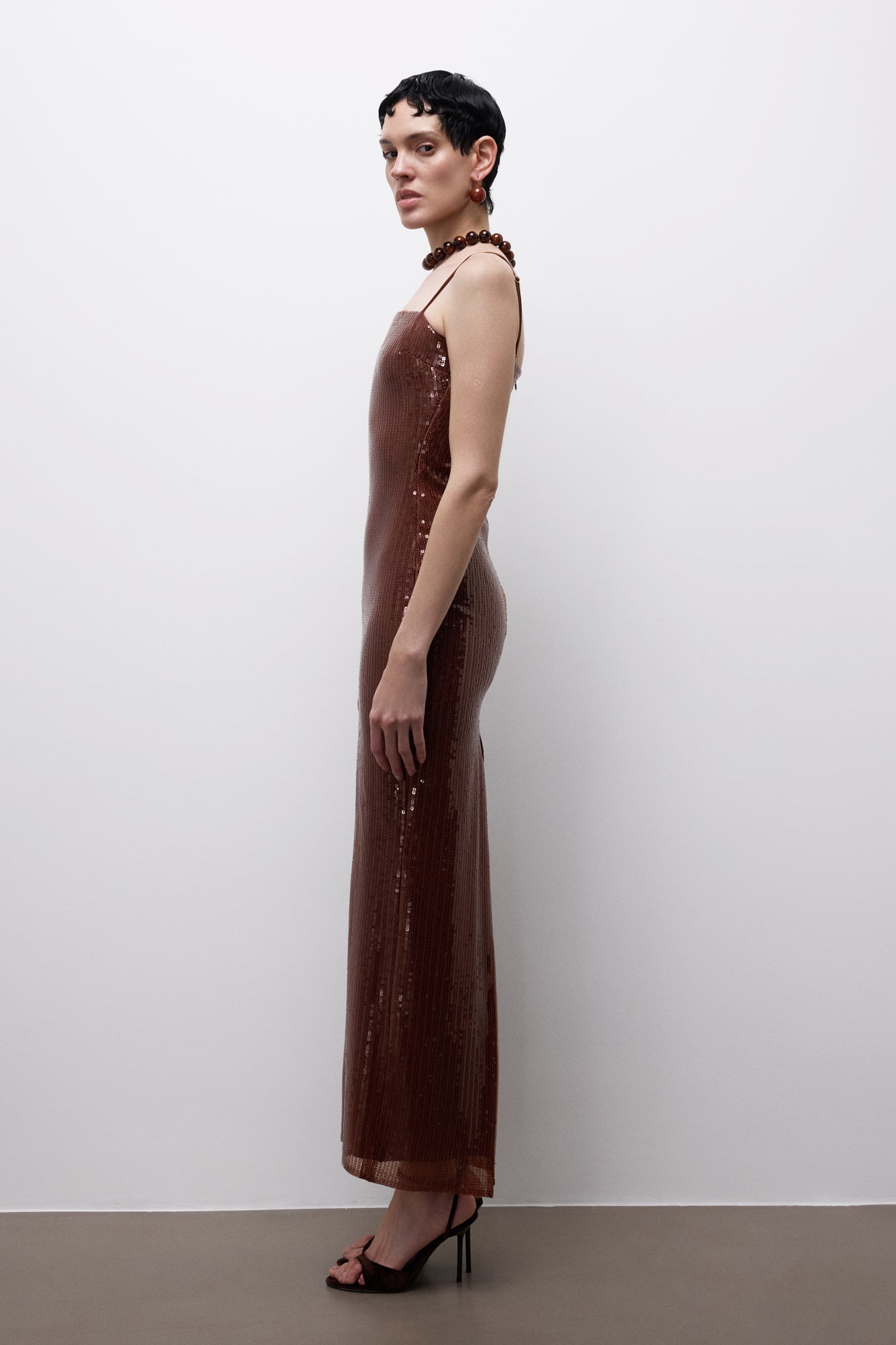 İnce askılı formu ve sade payet dokusuyla zamansız ve dengeli bir duruş sunar.