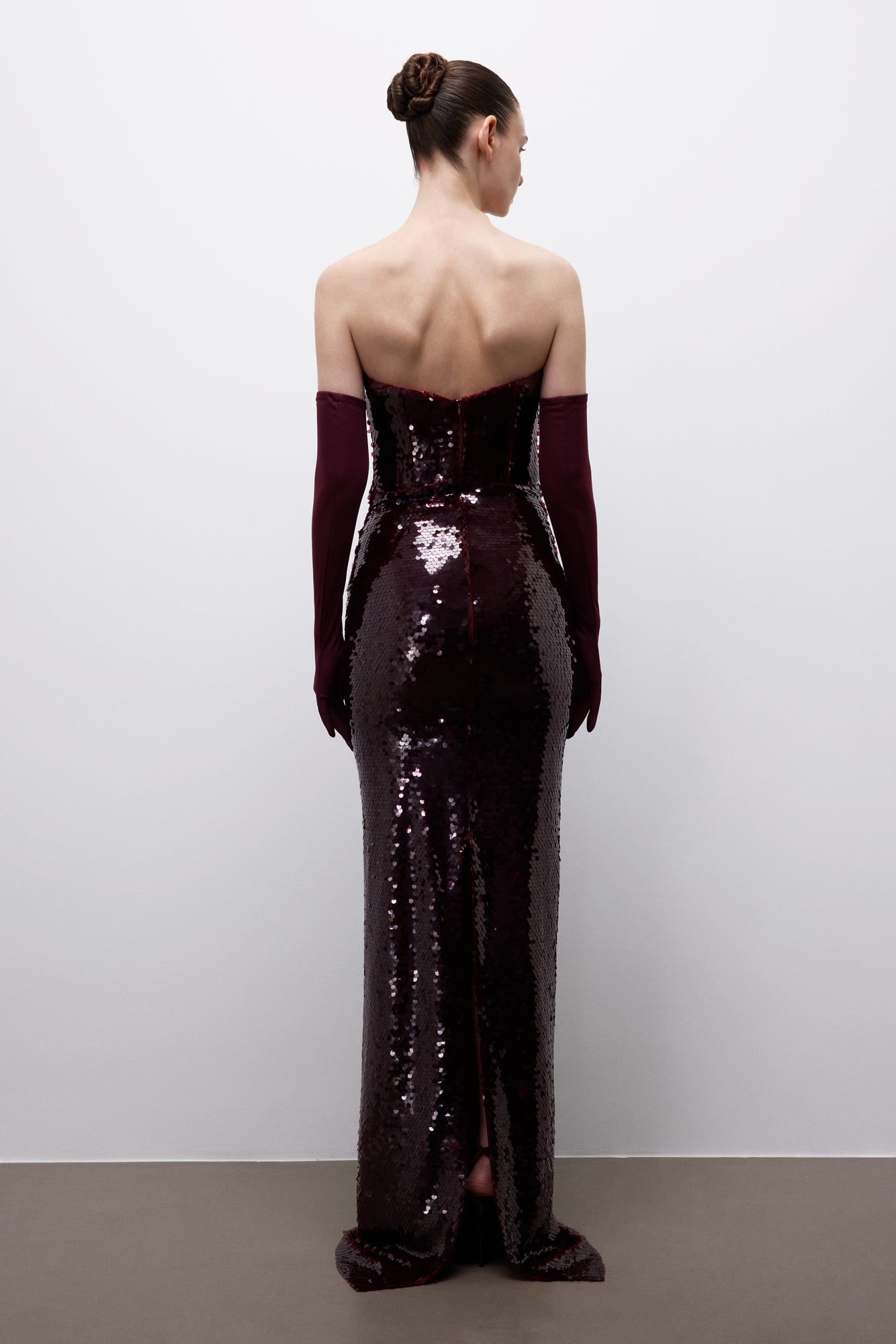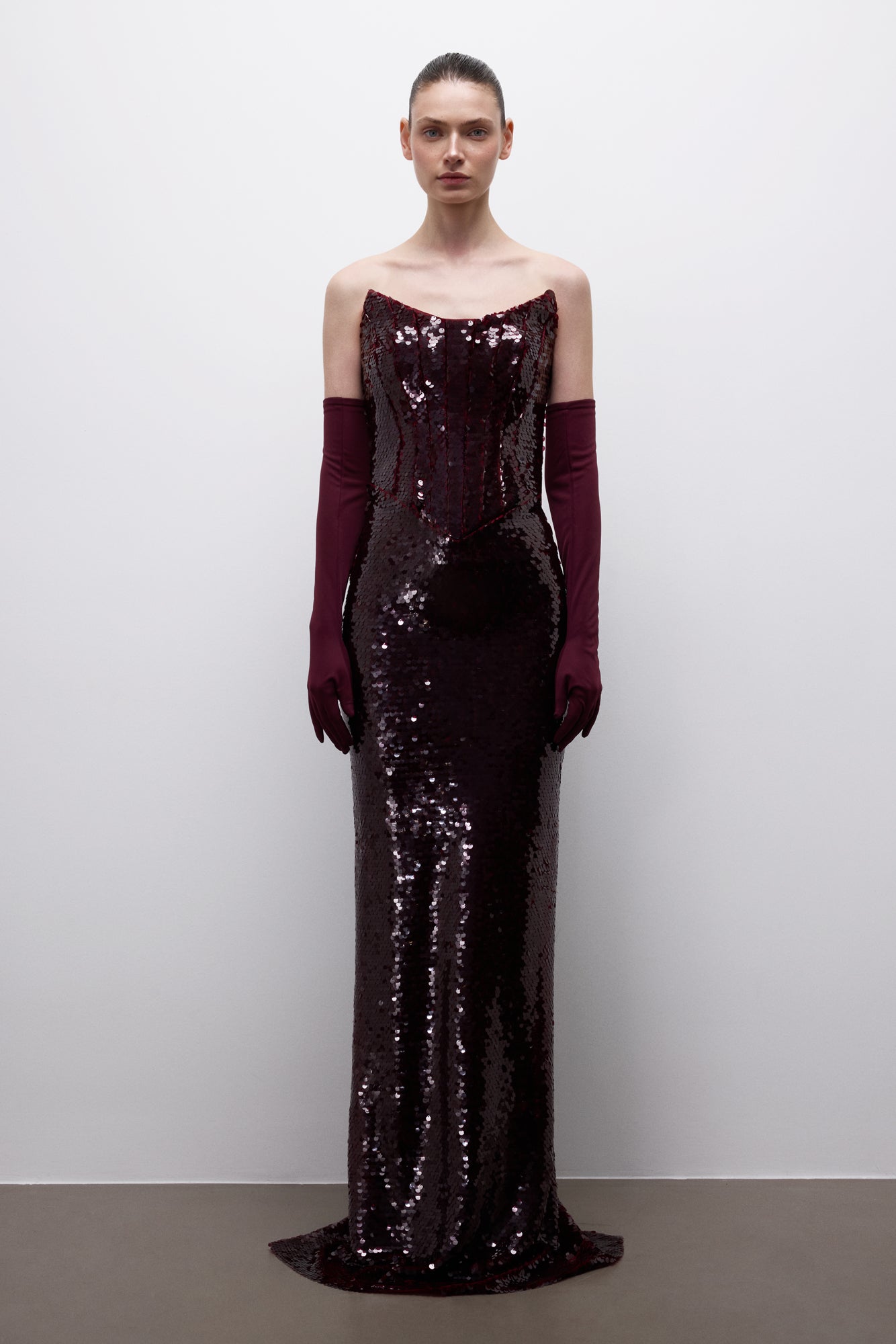 Umbra Sigil Dress, gücün sessizlikle mühürlendiği kadim bir ritüelden ilham alır. Heykelsi korse yapısı ve derin tonlardaki payet yüzeyi, bağlılık ve kontrollü ihtişamı yansıtır.