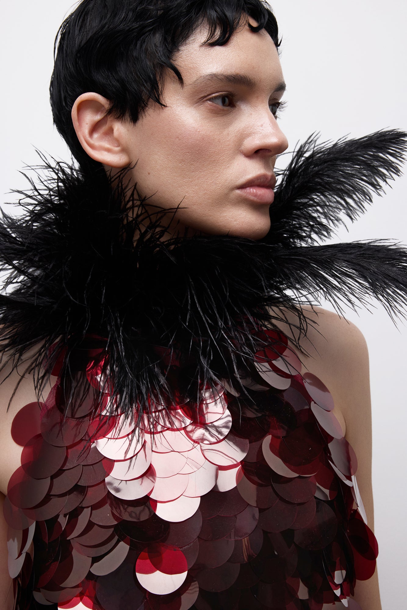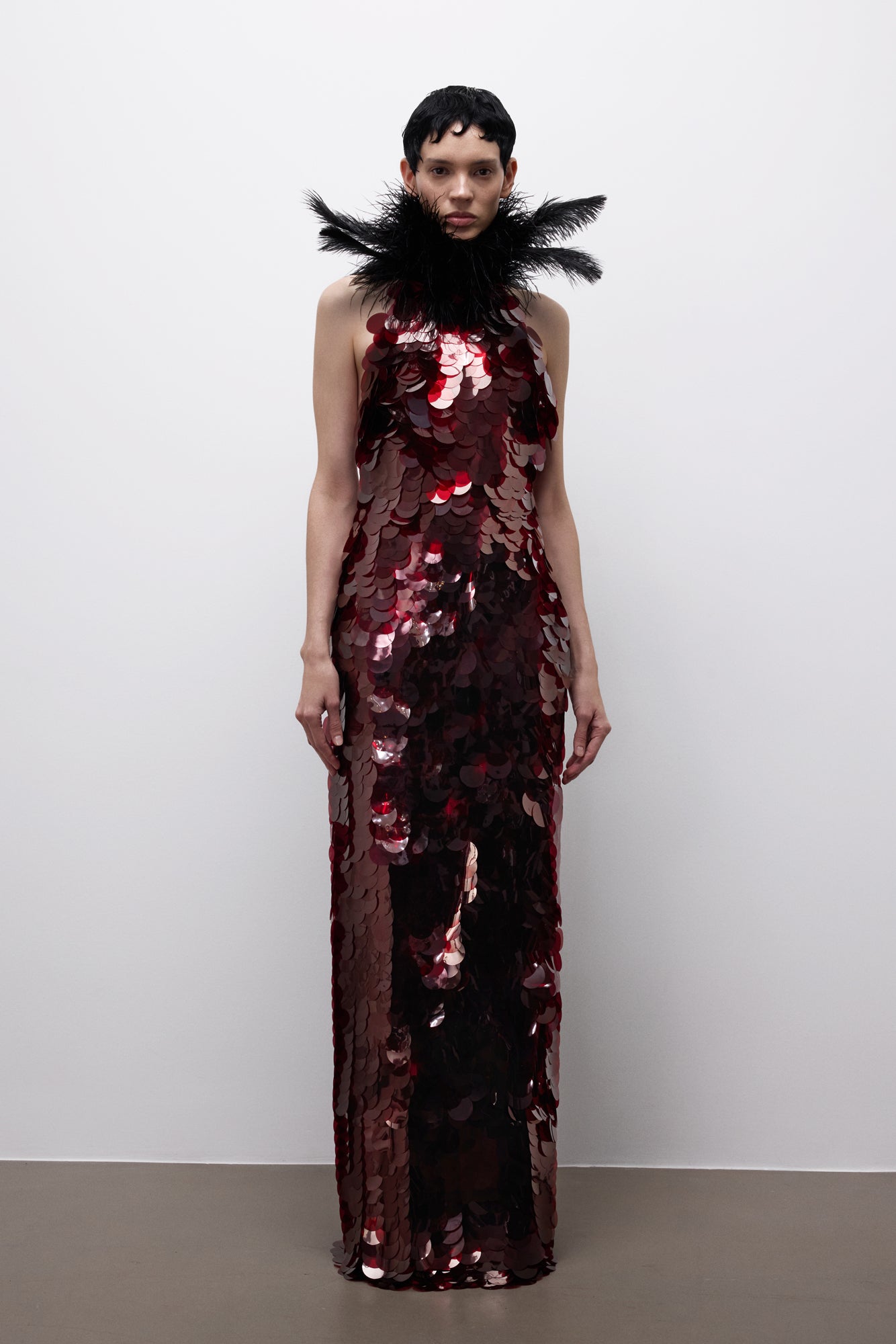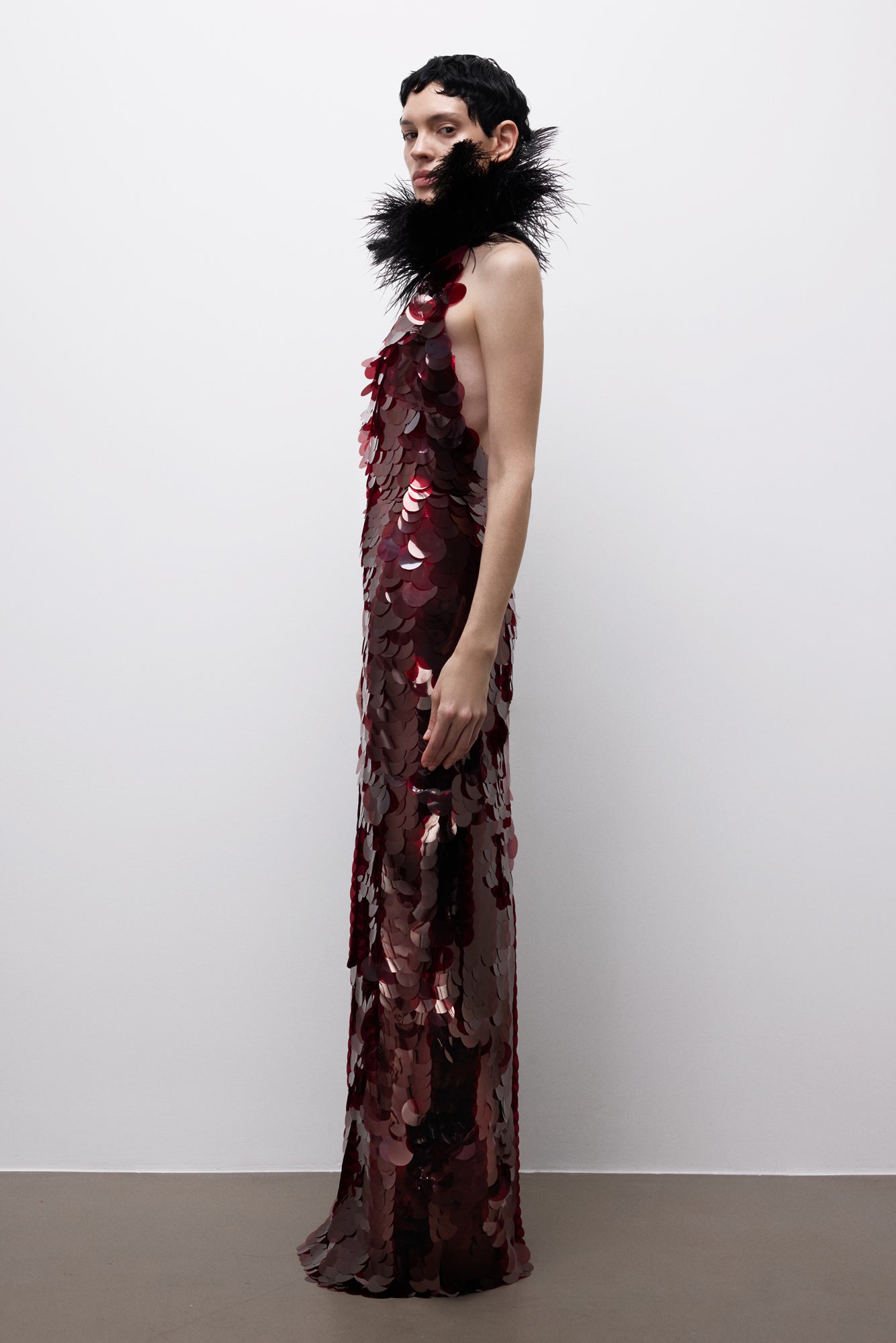 Veiled Rite Dress, gücünü ritüelden ve ölçülü bir ihtişamdan alır. Vücudu saran heykelsi silueti, tüy detaylı dramatik yaka ile tamamlanarak törensel ve etkileyici bir duruş sunar. Abartıya başvurmadan etki yaratan bu tasarım, görünmeden hükmedenlerin sessiz otoritesini yansıtır.