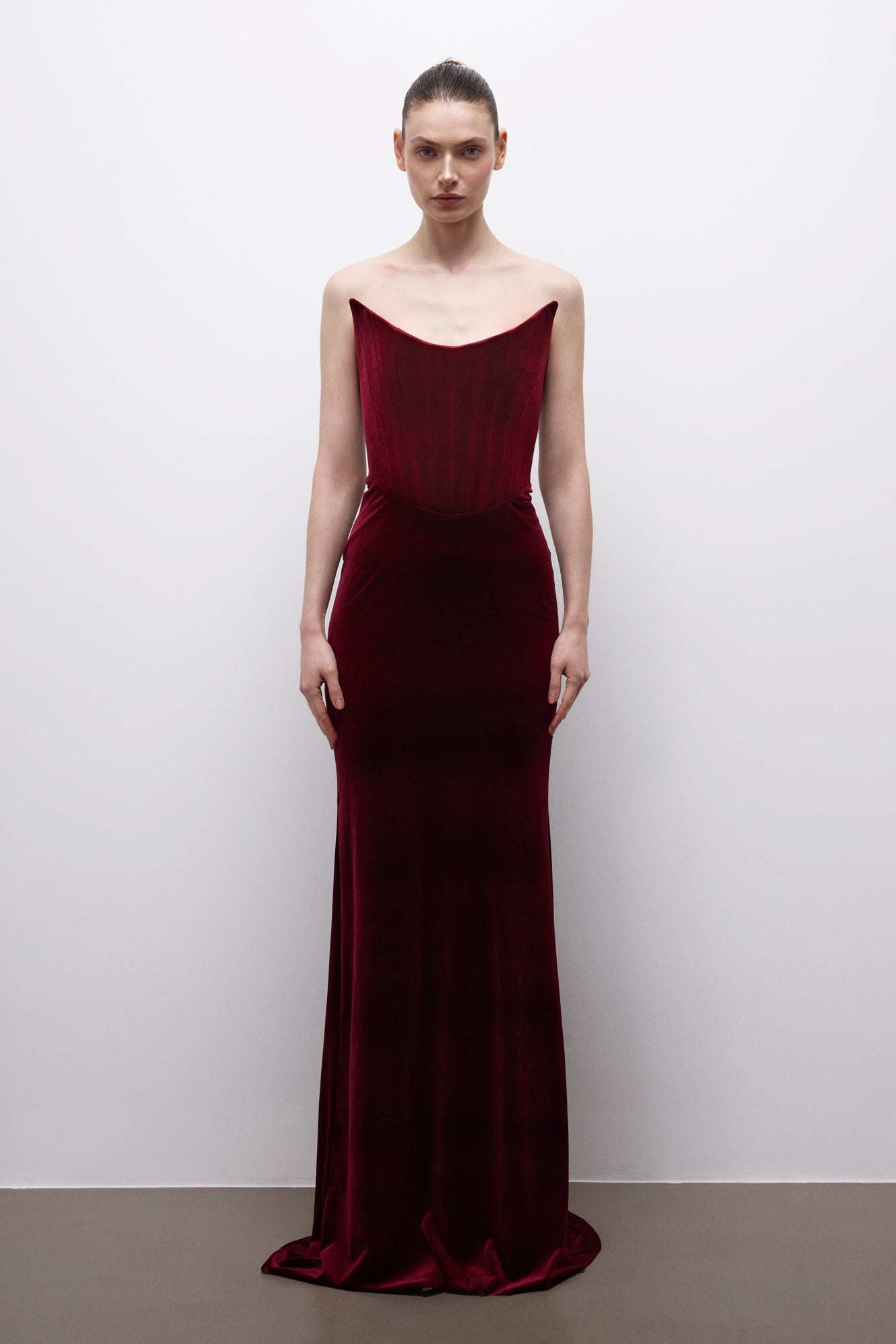 Virelya Veil Dress, gücünü kadim gece ritüellerinden ve törensel siluetlerden alır. Heykelsi korse yapısı bedeni sessiz bir otoriteyle sararken, derin bordo kadife kontrollü bir zarafetle akar. Zamana meydan okuyan, güçlü bir duruş için tasarlandı.
