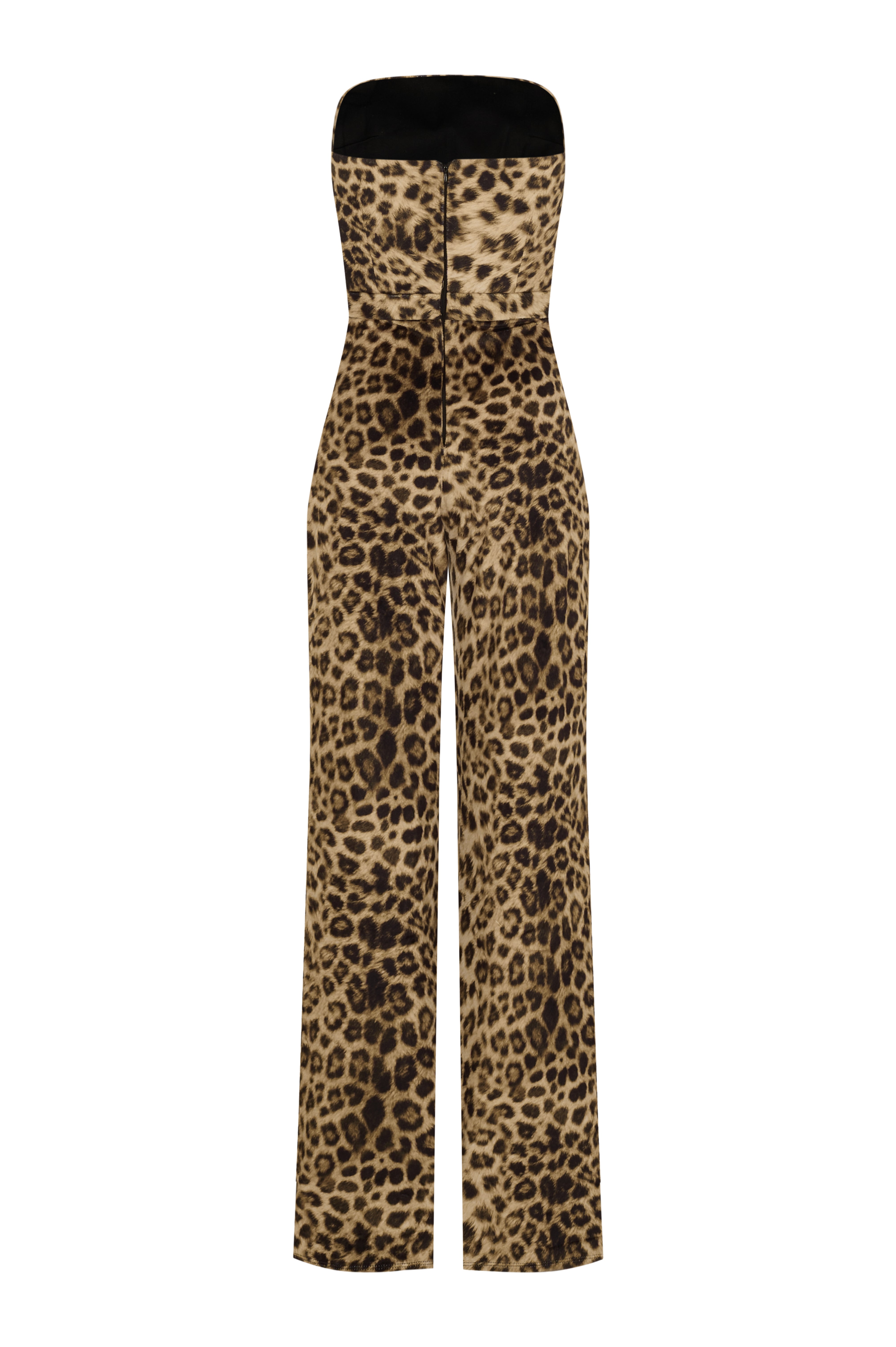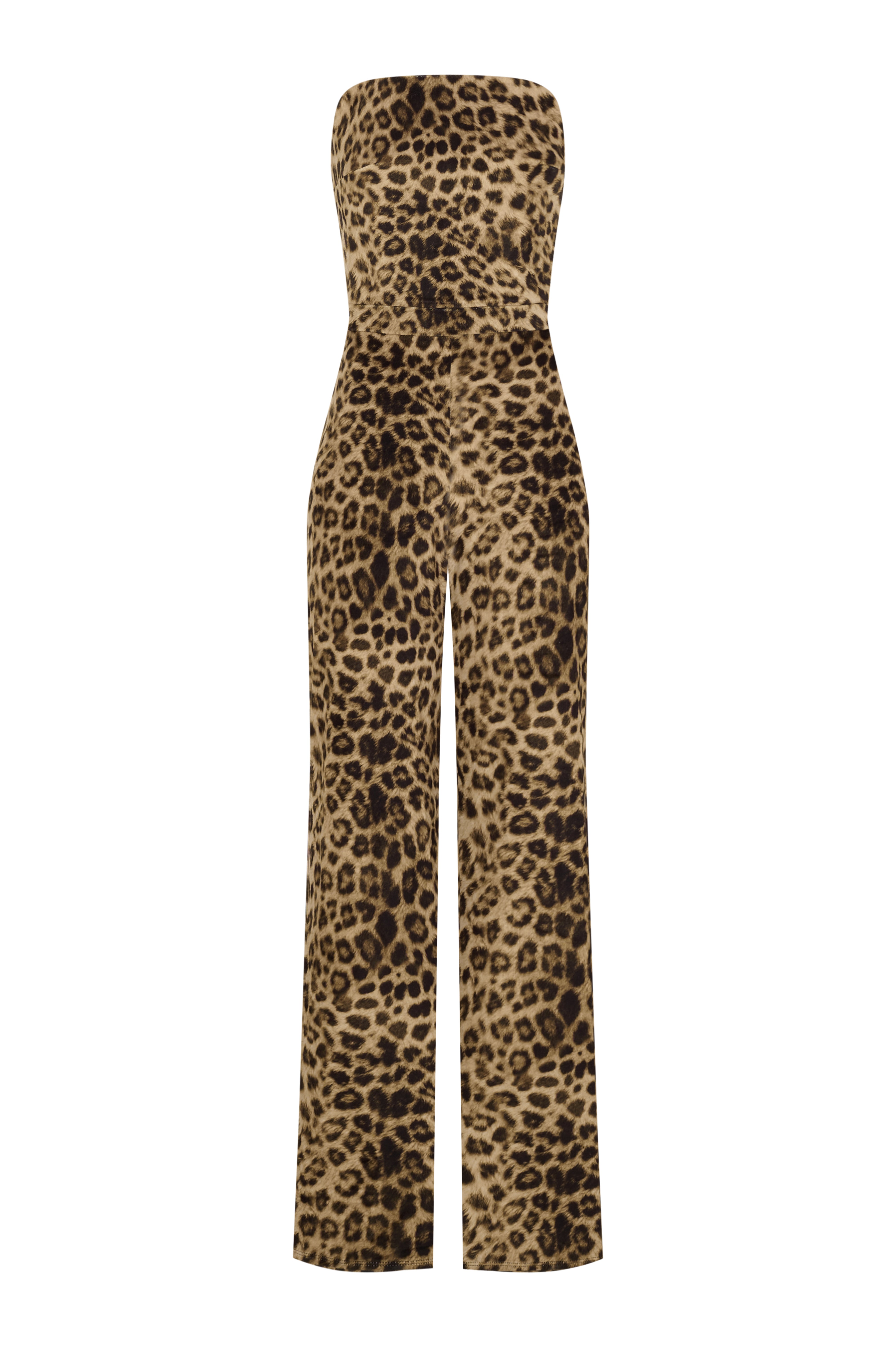 Wild Mirage Jumpsuit, leopar deseni ve strapless kesimiyle modern, özgüvenli ve güçlü bir görünüm sunar. Rahat kesimi ve akıcı bacak formu sayesinde hem gece hem de gündüz kullanımına uygundur.